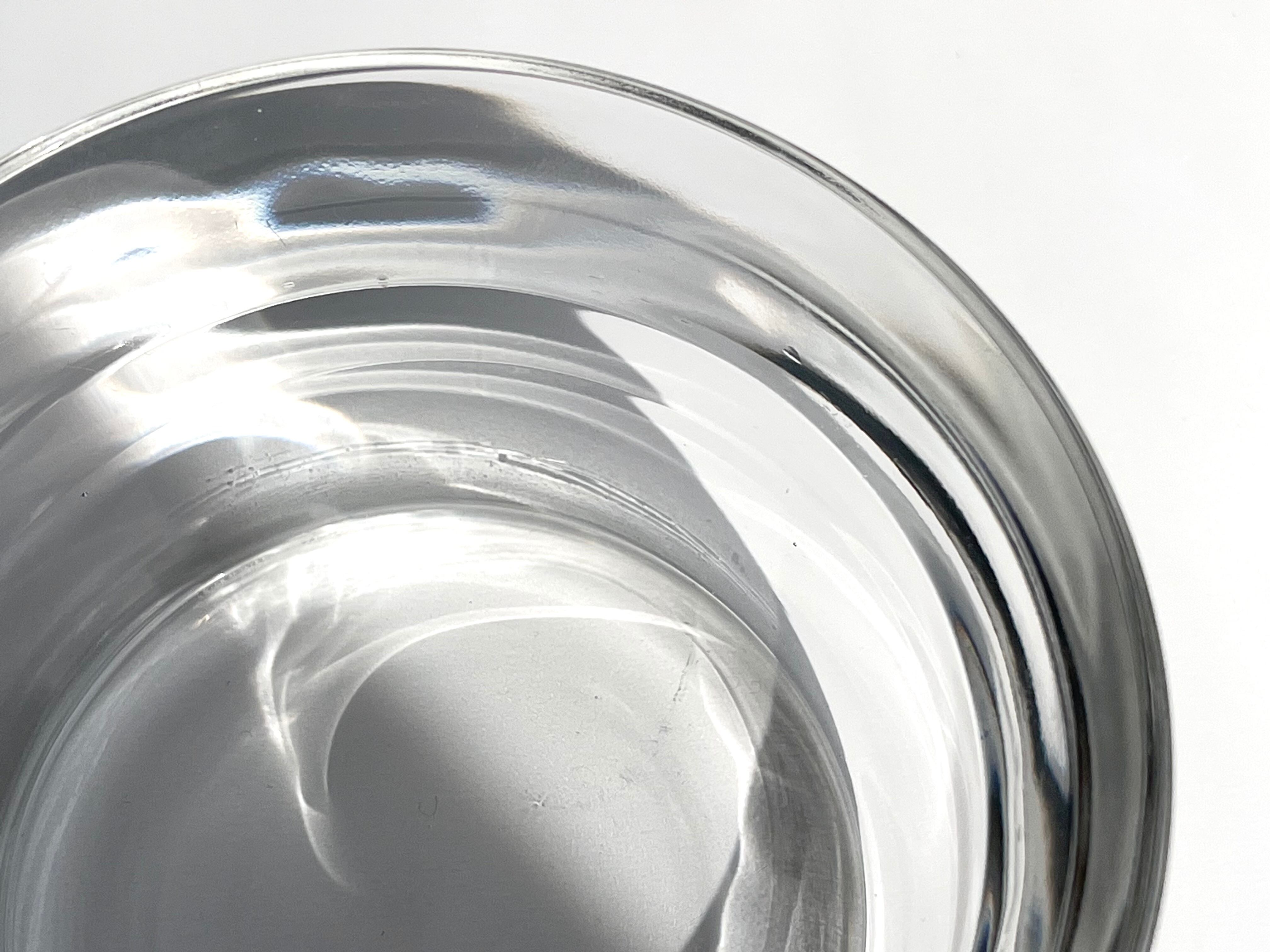 その他、製造時のものですが、極わずかな気泡の混入が見られます。また、底部にガラスが固まる際に生じた極微細な気泡を含む薄いうねりのような部分が見られます。この状態はイッタラやヌータヤルヴィの古いガラスで特にプレーンなものに多く見られる状態です。いずれも製造段階で出来てしまうもので、光に透かさなければ分からない程度であり美観を損ねるようなものではありません。