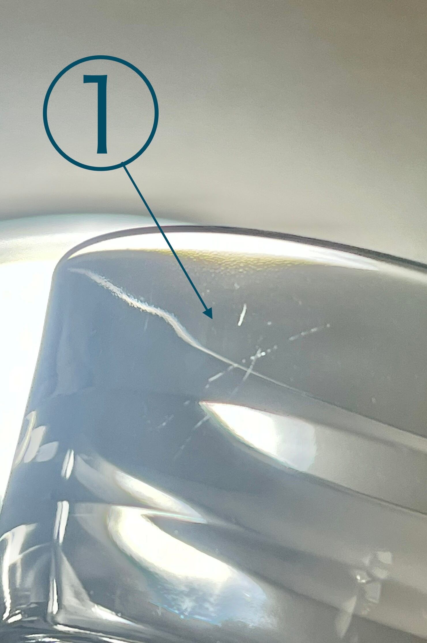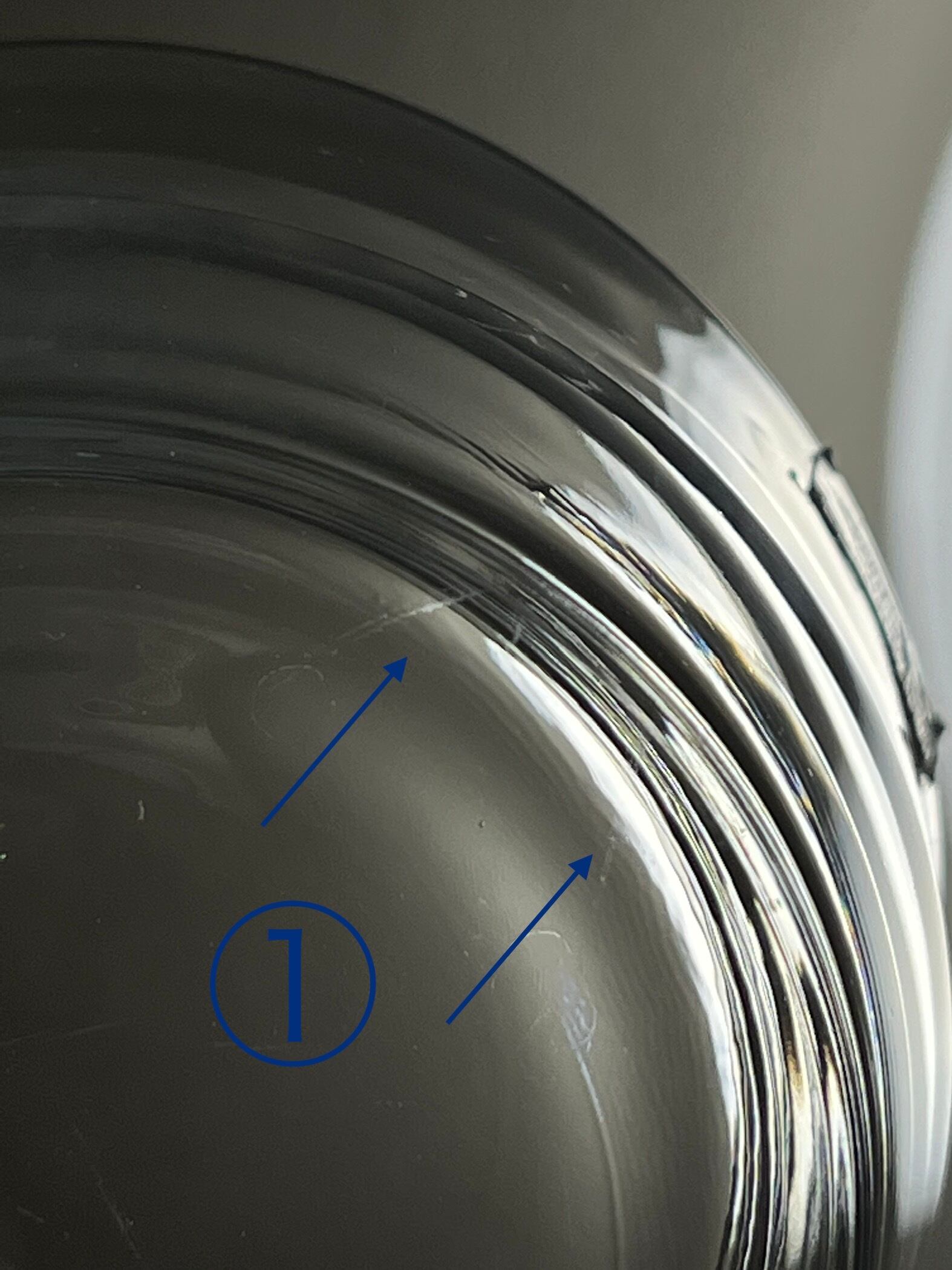 製造段階のものですが、本文でも明記したとおり底部内外両方に微細な気泡を孕んだようなガラスのうねりがあります。