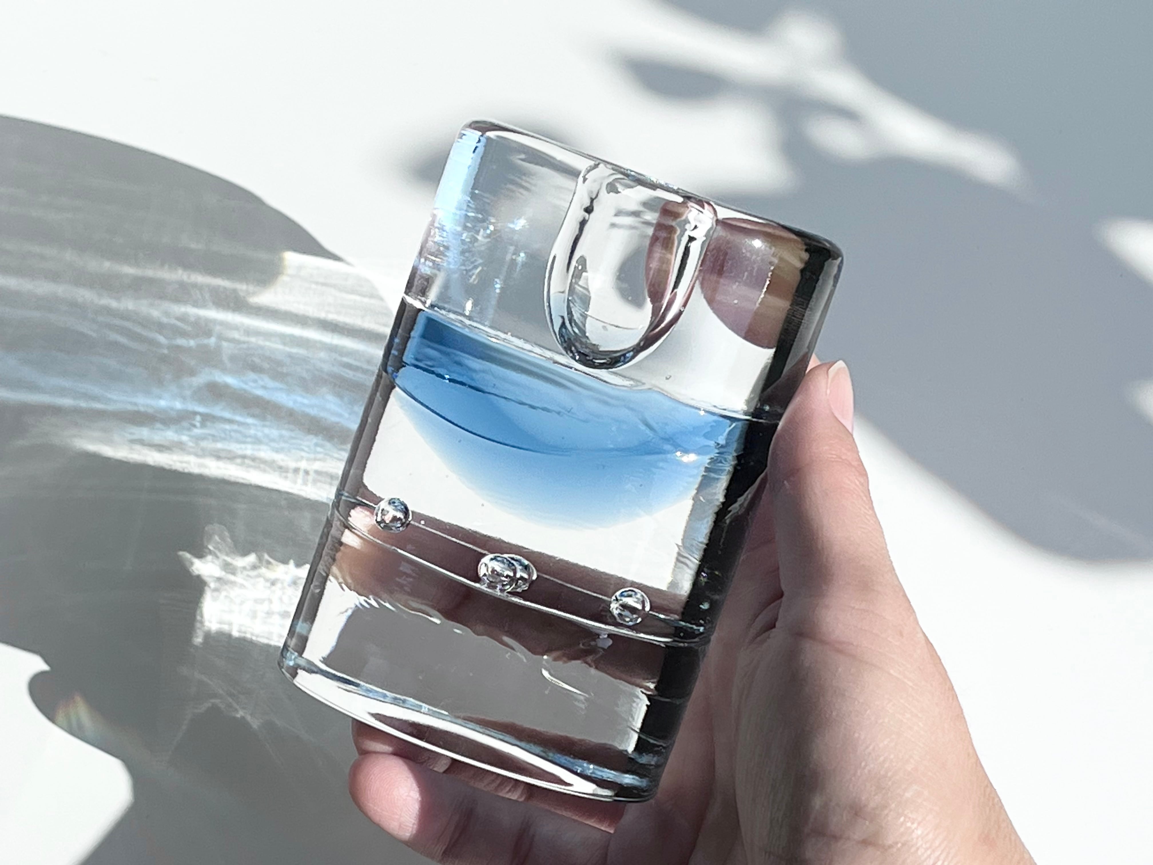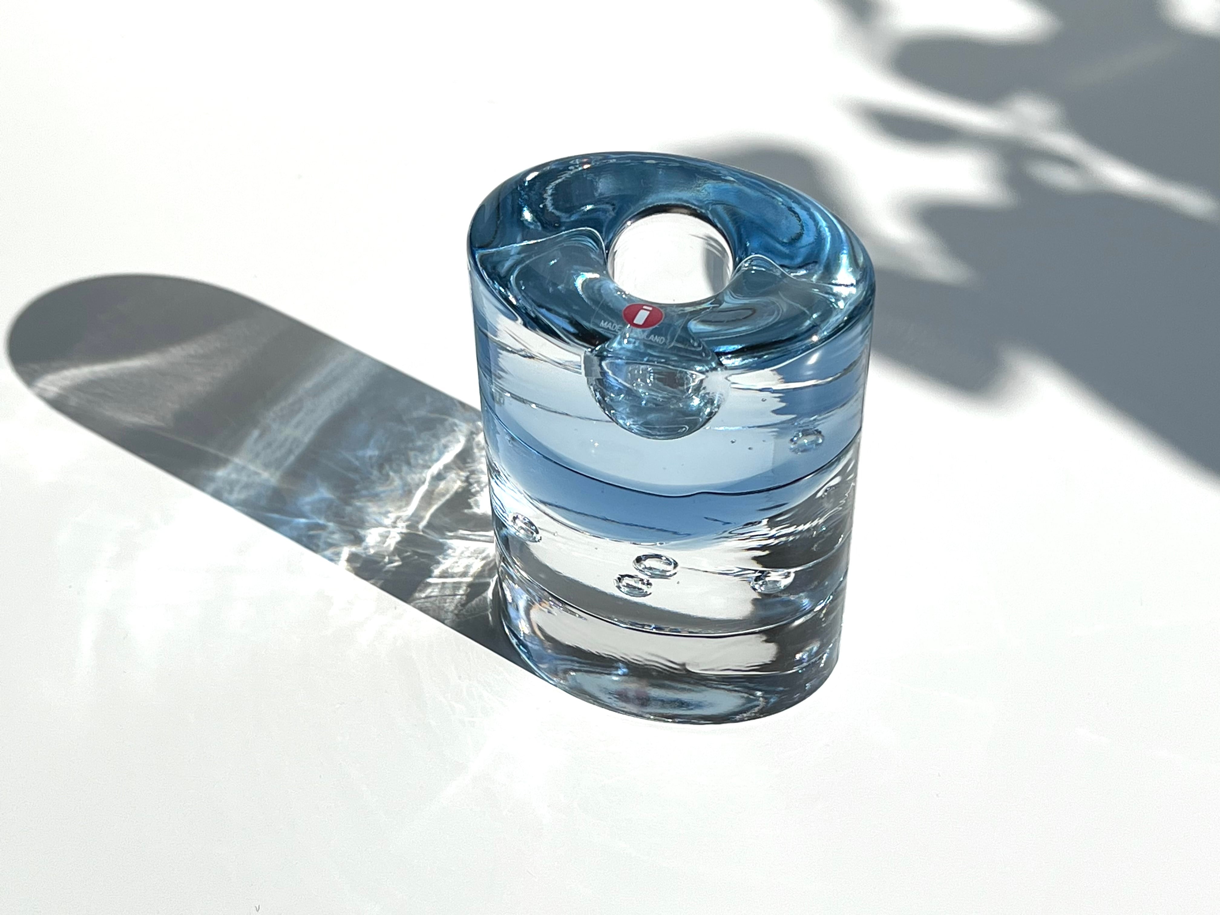 楕円形の円筒状をしたガラスには意図的なシワ、そしてブルーの色ガラスが層を成し、そこに一際煌めく大きな気泡が閉じ込められています。