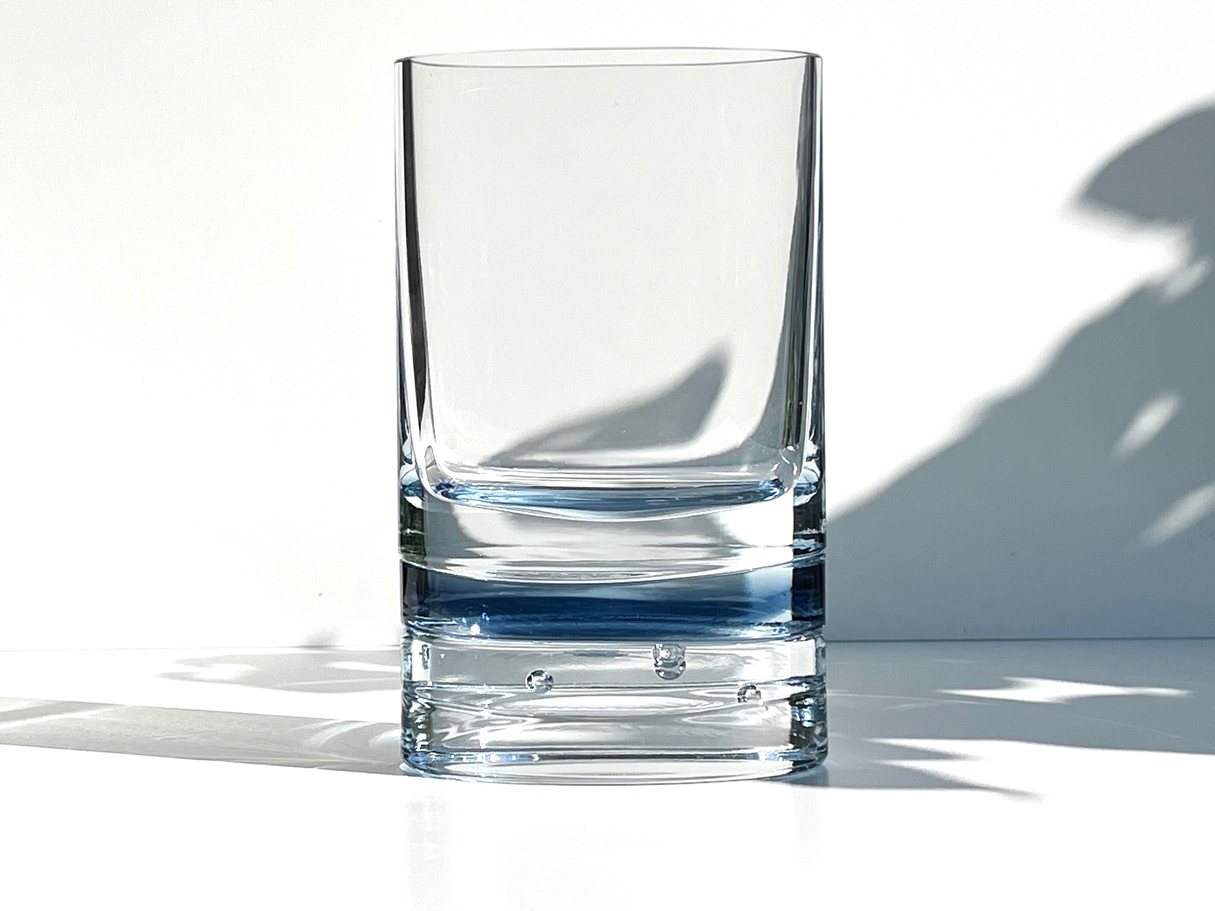 楕円形の円筒状をしたガラスの下部には8cm程のガラスの層が敷き詰められています。意図的なシワ、そしてブルーの色ガラスが層を成し、そこに一際煌めく大きな気泡が閉じ込められています。