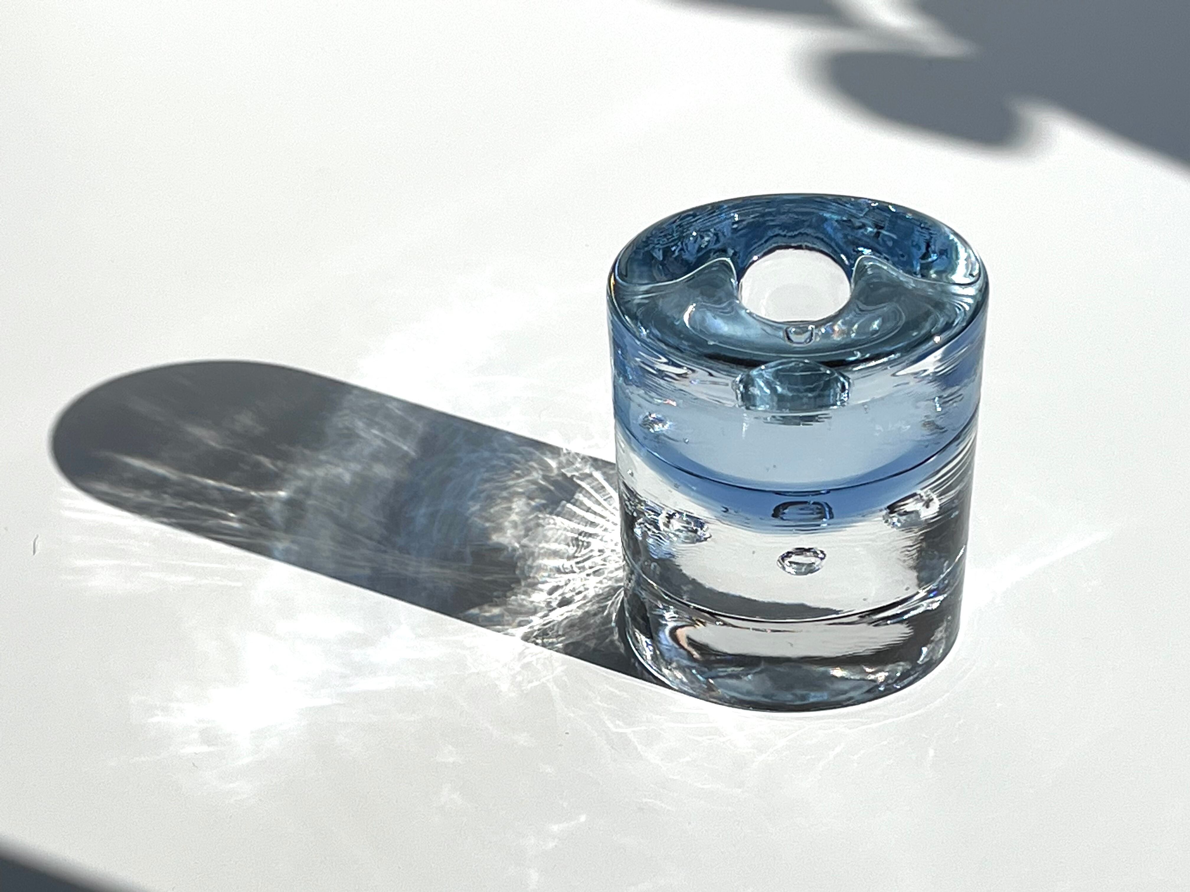 楕円形の円筒状をしたガラスには意図的なシワ、そしてブルーの色ガラスが層を成し、そこに一際煌めく大きな気泡が閉じ込められています。