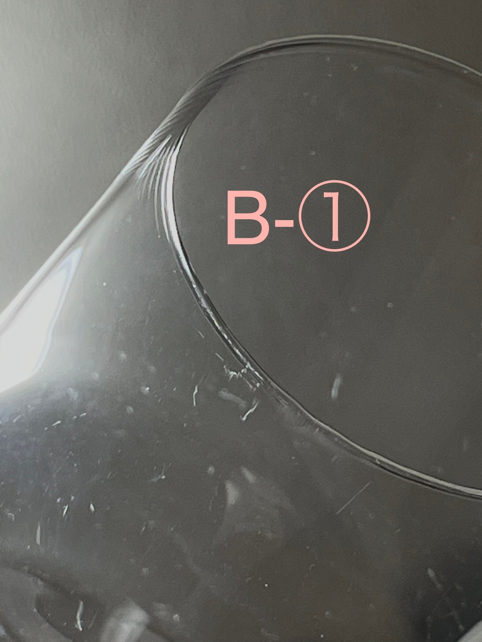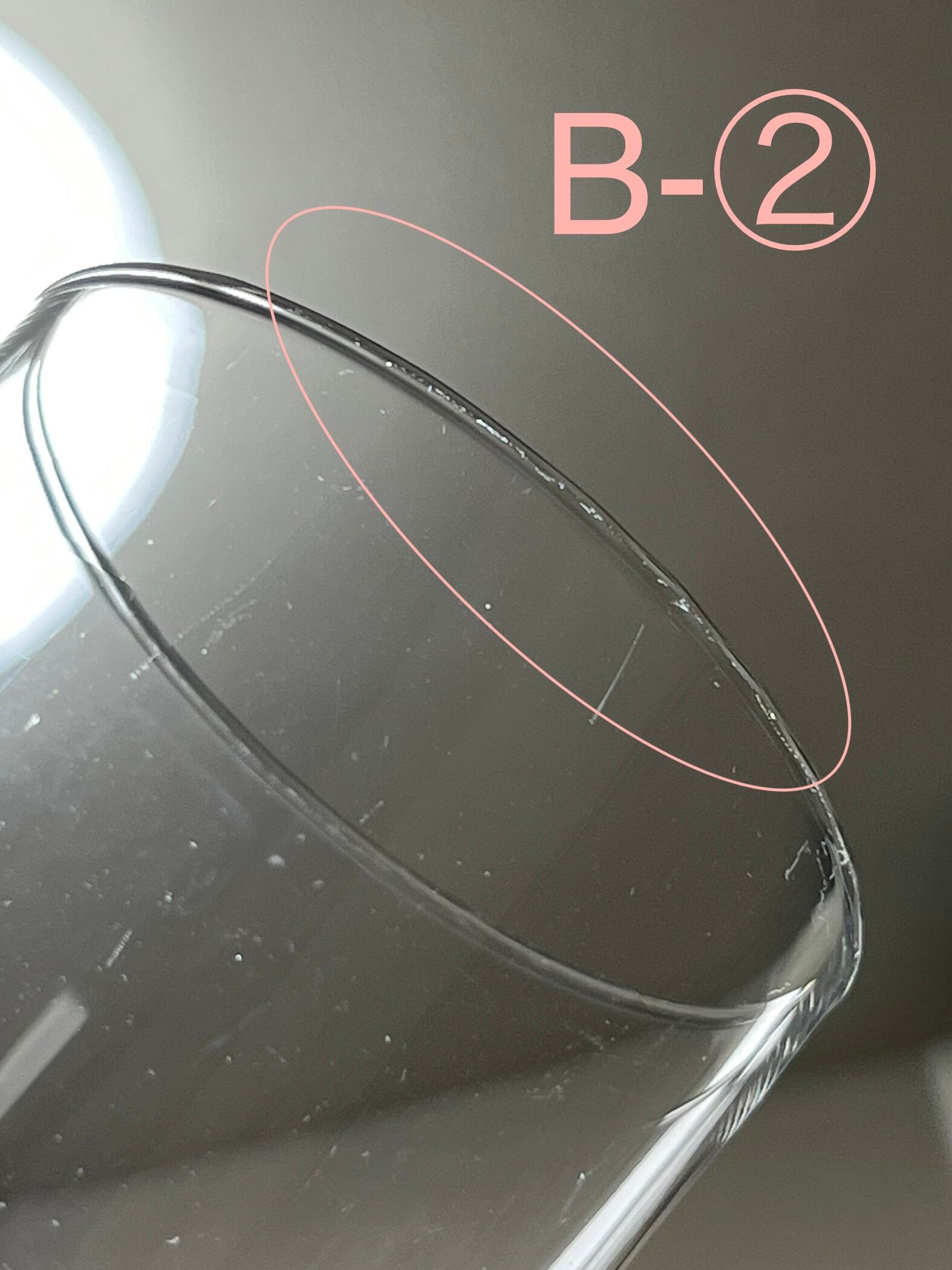 Bも僅かに擦れが見られますが通常使用時に気になるほどのものではなく、光にかざしたり黒いものをバックにすると見えくる程度のものです。