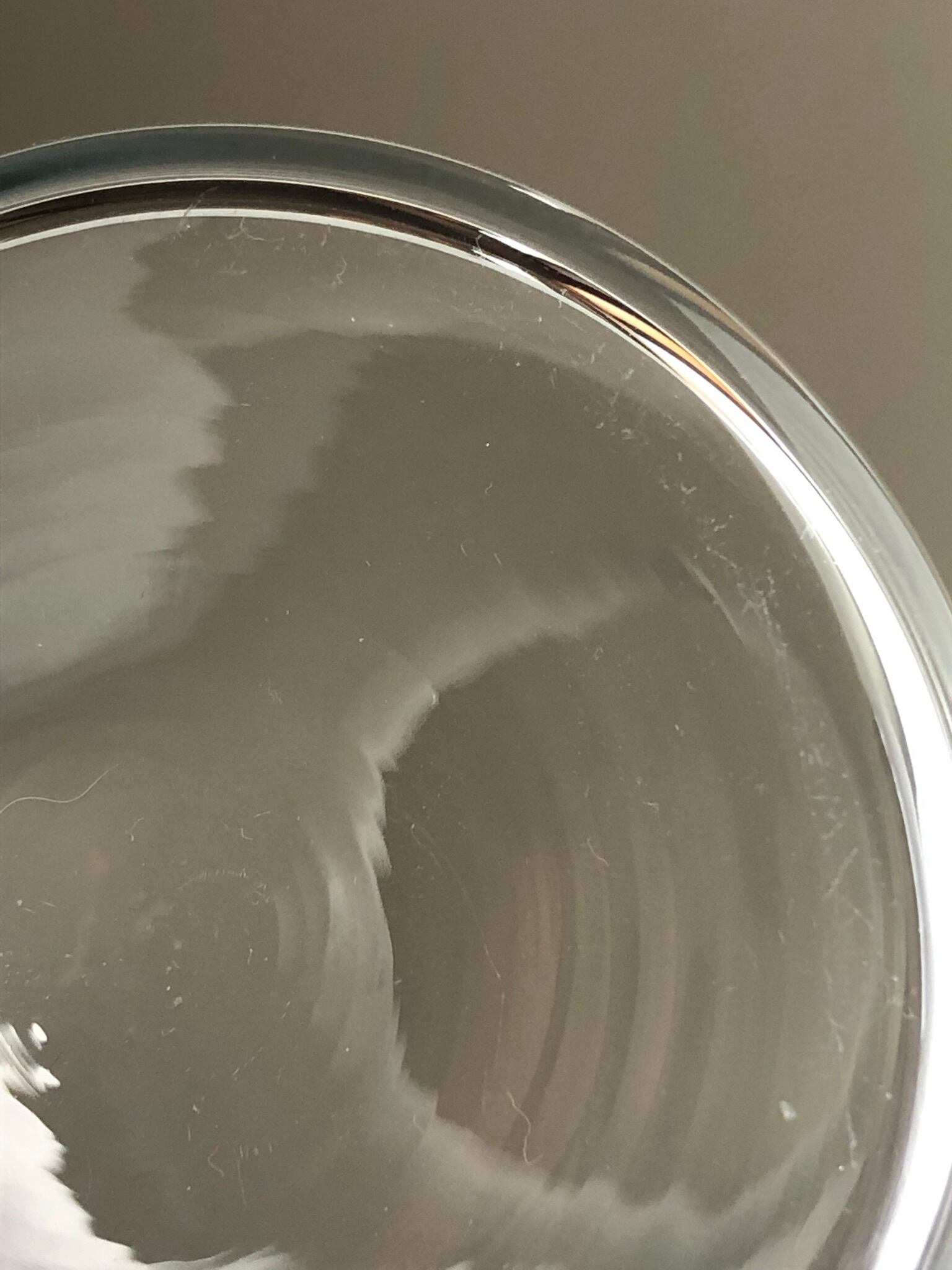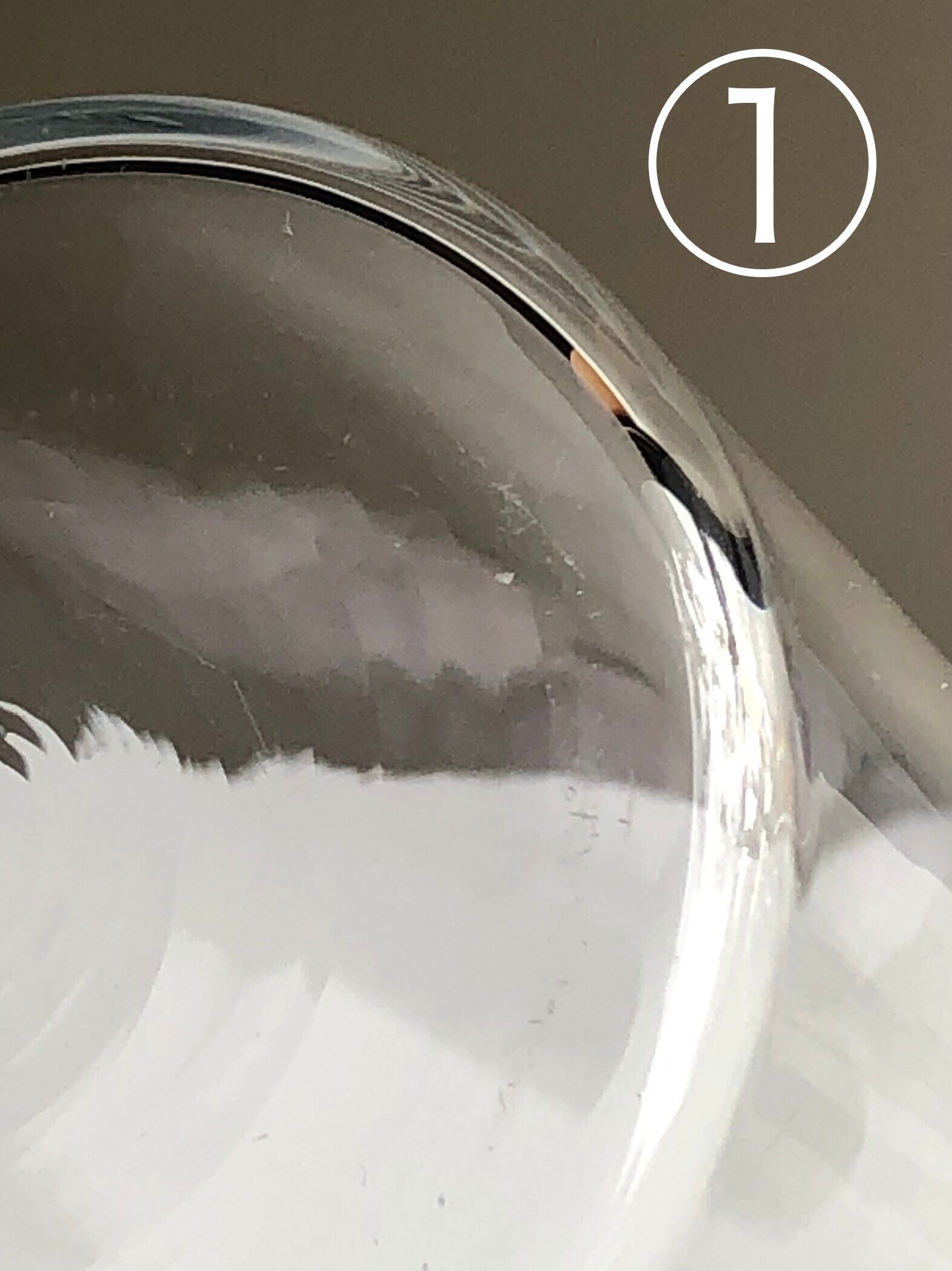 製造時から物として、吹きガラス特有のガラスの揺らぎや、僅かな気泡の混入が見られます。マークアップ画像②でご確認ください。