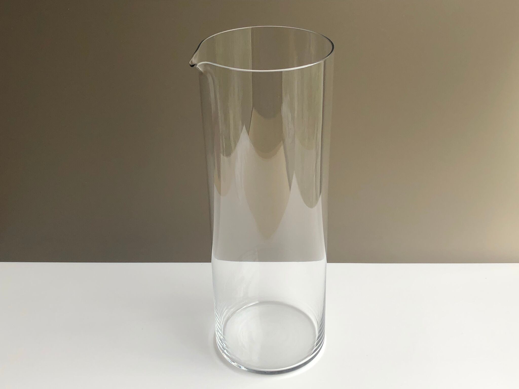 デザインされた当初は下に向かってやや窄まったフォルムをしていましたが、1955年にグラスをピッチャーの中に収めた状態で、筒状のギフトBOXにセットして販売することになり、このまっすぐなフォルムに改修されたのだそうです。