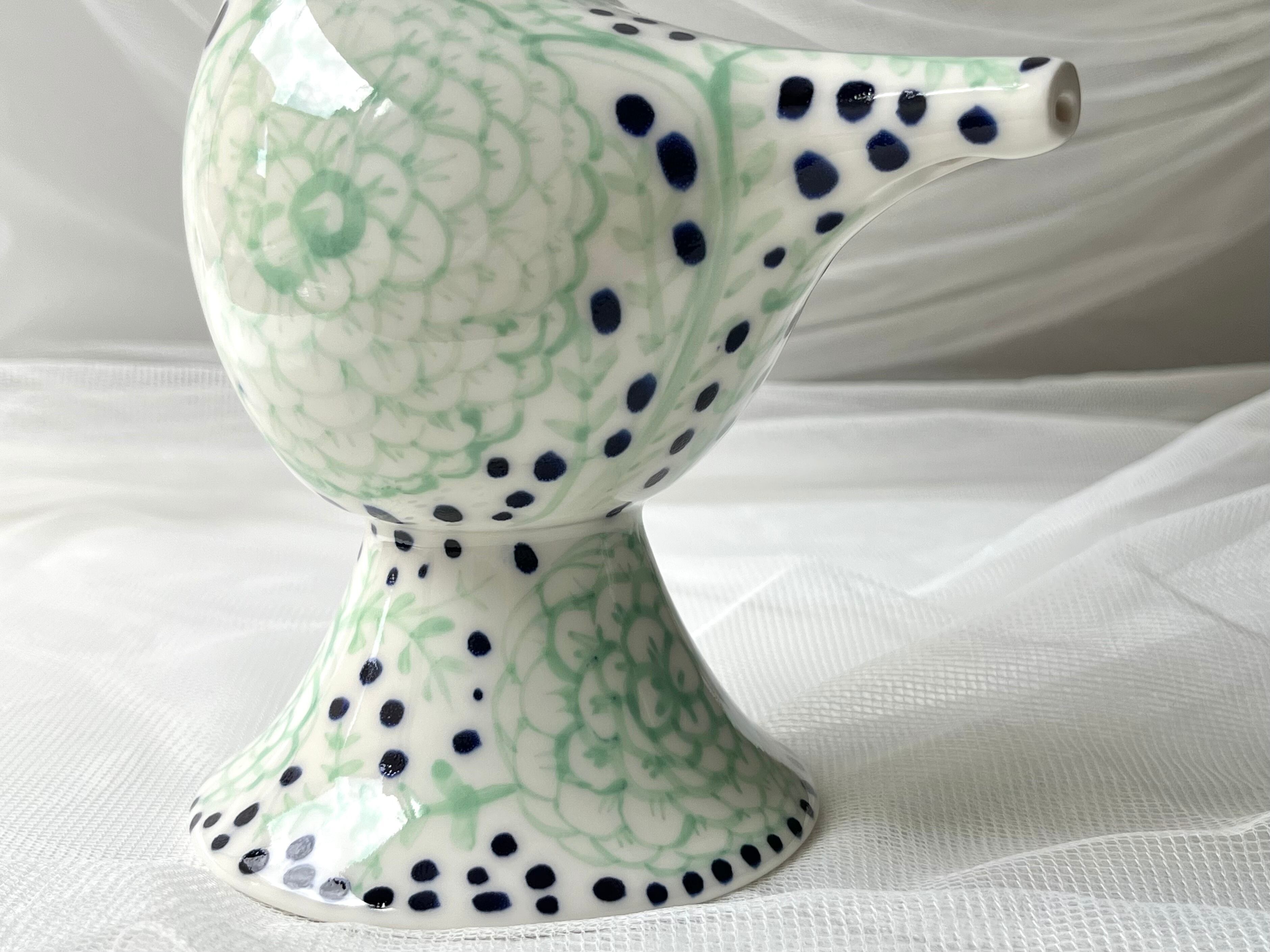 白地の雄鶏に呉須で細かな小花柄が絵付けされており、このまま飾るだけでもかわいいのですが、時折手に取ってひと吹きすればちょっとしたリフレッシュにもなりそうです。