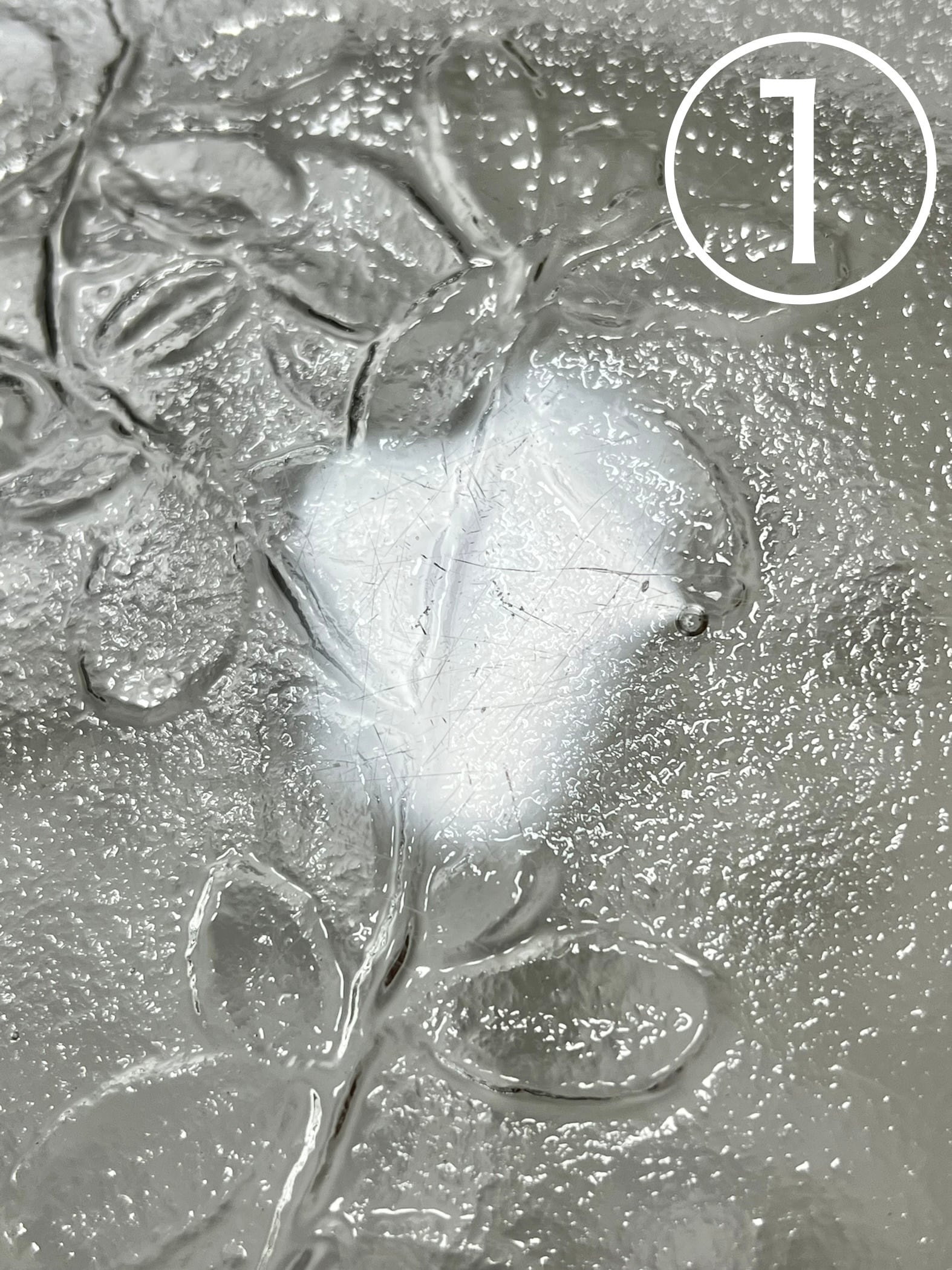 小さな気泡の混入が見られます。また、製造時よりプレートの縁は均一でなく揺らぎがあります。また、特筆しない場合でも微細な気泡やガラスの僅かなヨレ、しわなどが見られることもございます。
