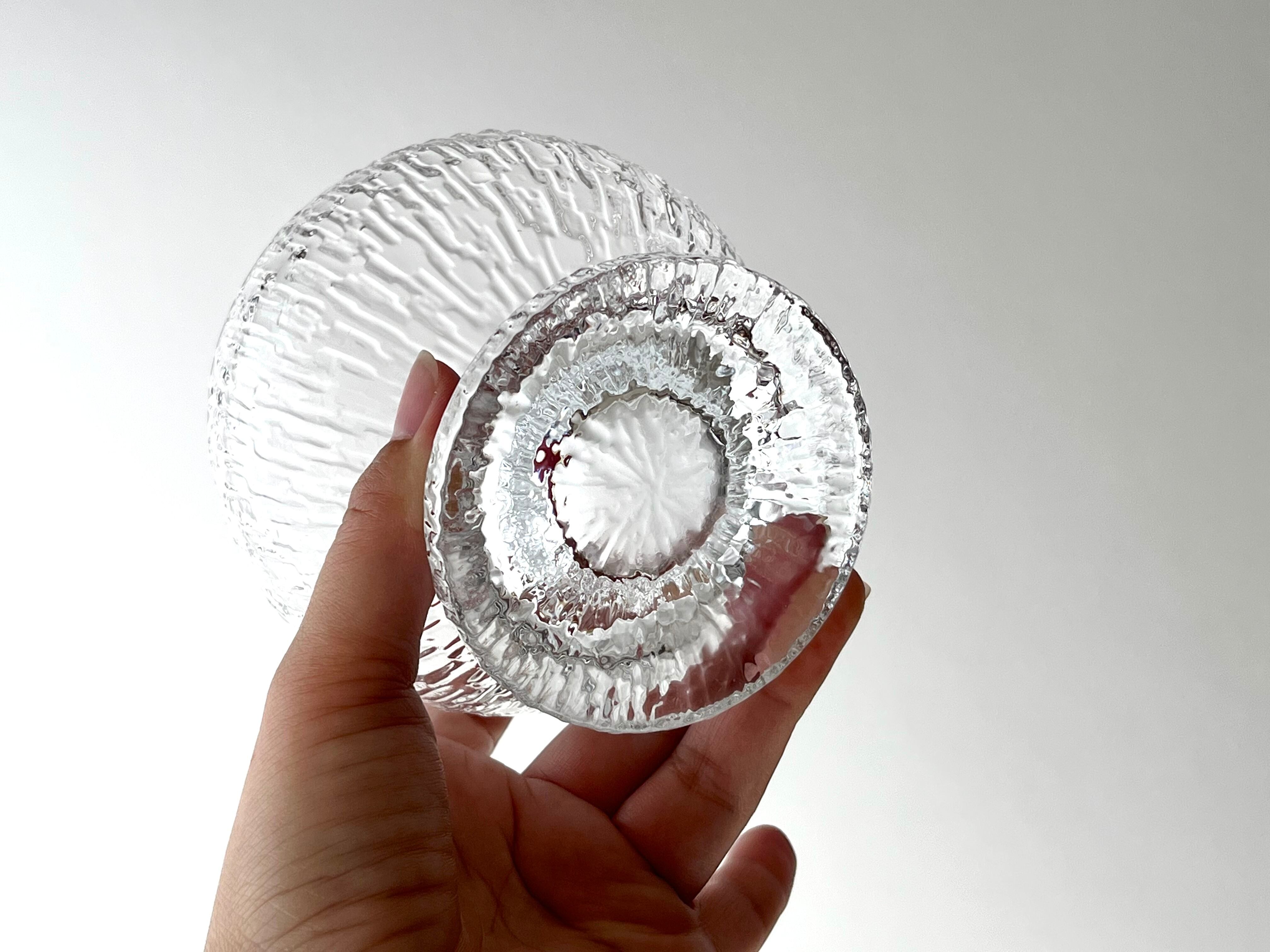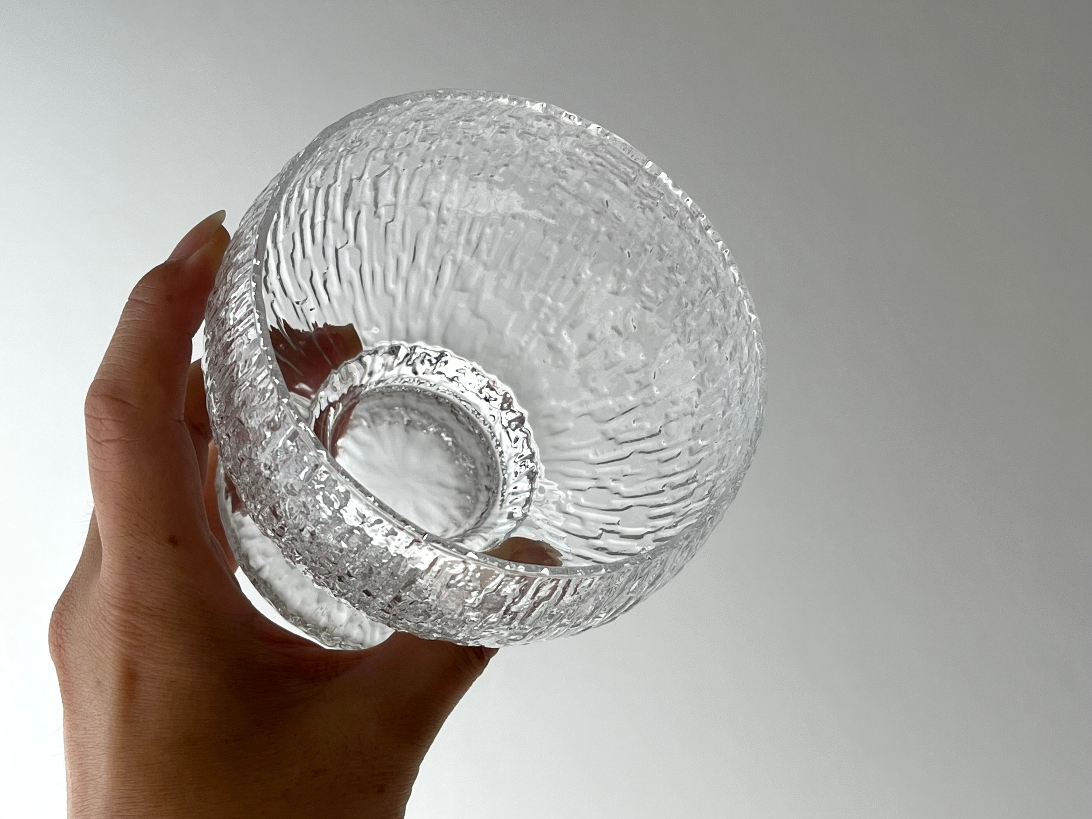 サルパネヴァは1960年代に木型を用いて、木の表面が焦げた跡をガラスにそのまま転写させたような有機的なデザインを多く生み出しましたが、このケッケリトの表面にも木型を用いたかのような模様がエンボスで表現されています。