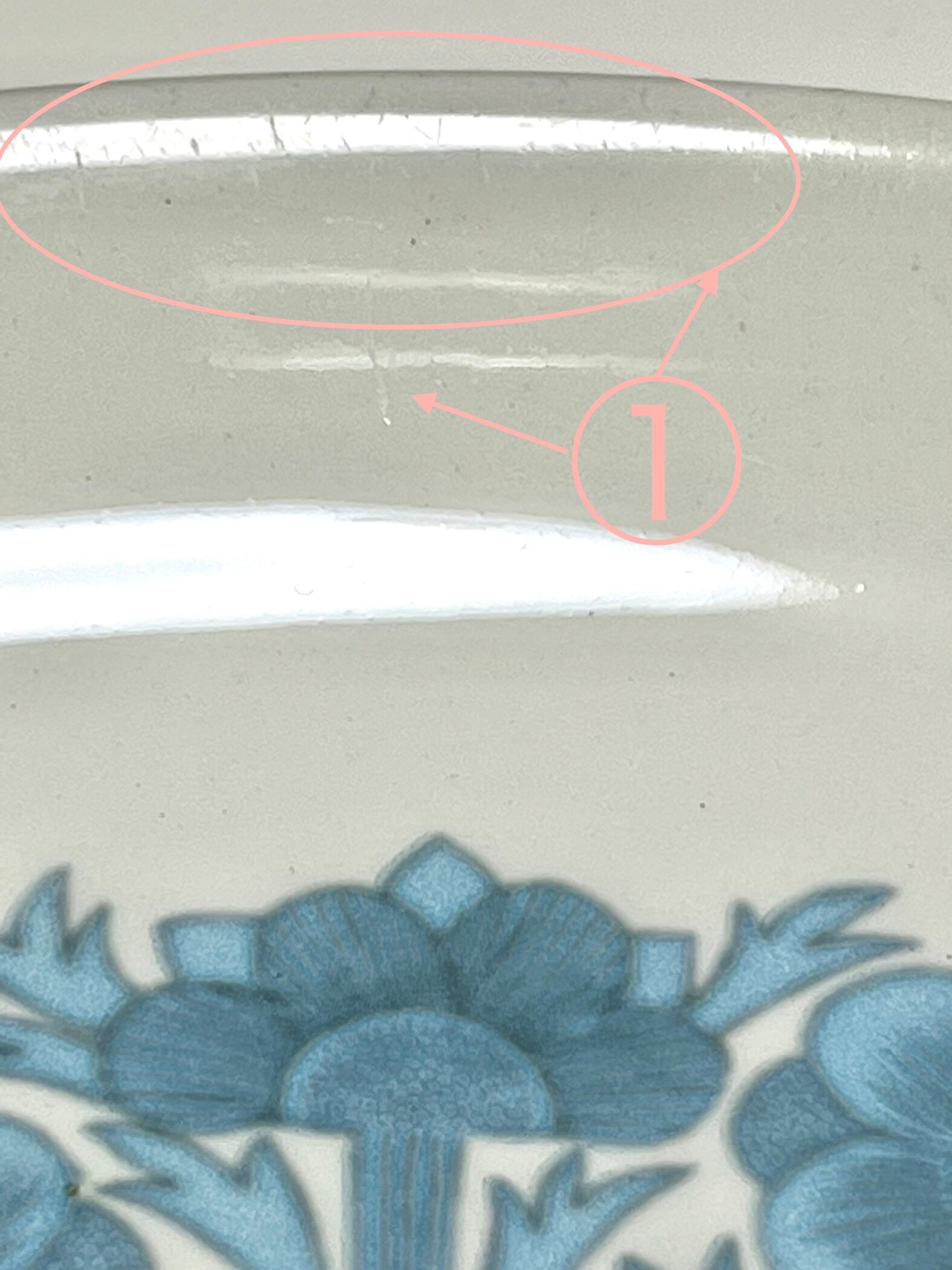 製造由来の状態として、カップアンドソーサー等の小さな同アイテムに比べてプリントのアウトラインが淡めです。(アウトラインはグレーに見えます)また、中心部分に極微細な点状の色抜けが見られます(白い点のようなもの)。その他、リムのあたりの釉薬下に3mm程の長さの製造傷が見られます。素地が乾いていない特に職人の爪が当たったような雰囲気に見えます。しっかり釉薬がかぶっているので使用に問題はありません。また普段はほとんど気にならないと思います。その他、特筆しないものでも微細な釉薬のスポットや黒点が見られます。