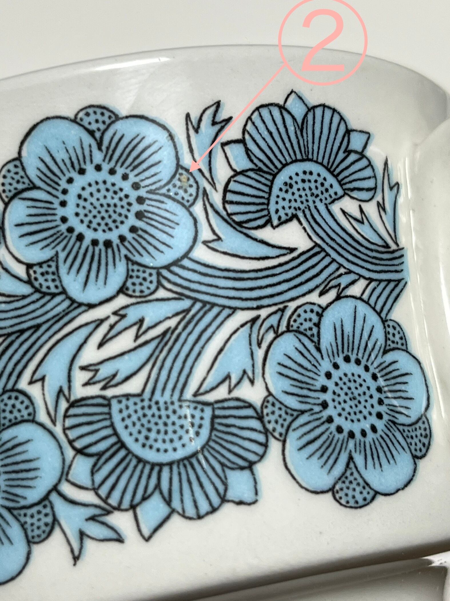 製造由来の状態として、プリントのアウトラインに独特の揺らぎが生じている部分があります。また素地のピンホールやムラが重なっている部分に微細な色抜けが見られます(白い点のようなもの)口縁部分の内側はやや釉薬が厚くかかっており、手で触れるとやんわりと段差を感じます。また口縁の縁に釉薬の弾けによる微細な突起等見られます。その他、特筆しないものでも微細な釉薬のピンホールや黒点が見られます。