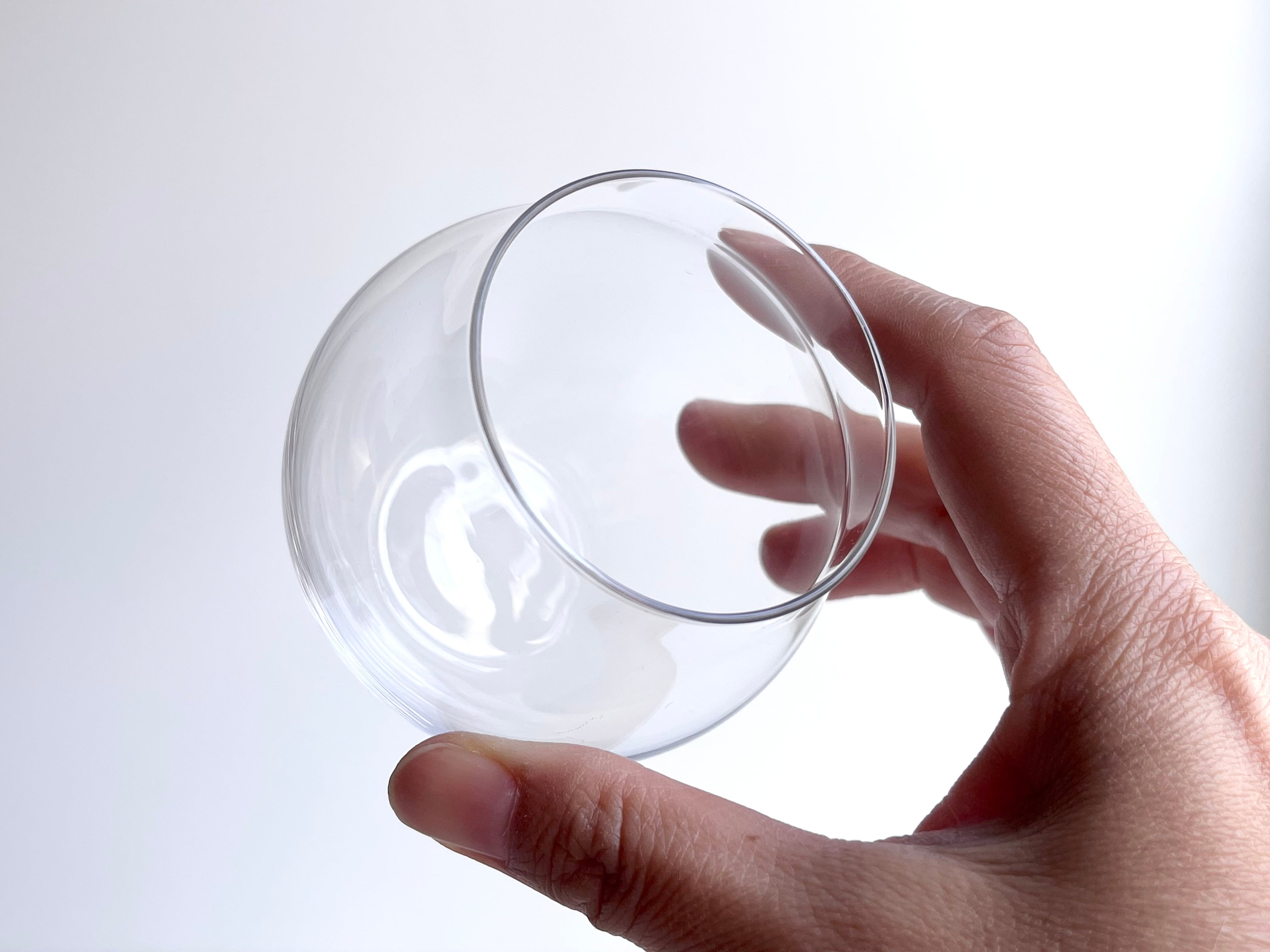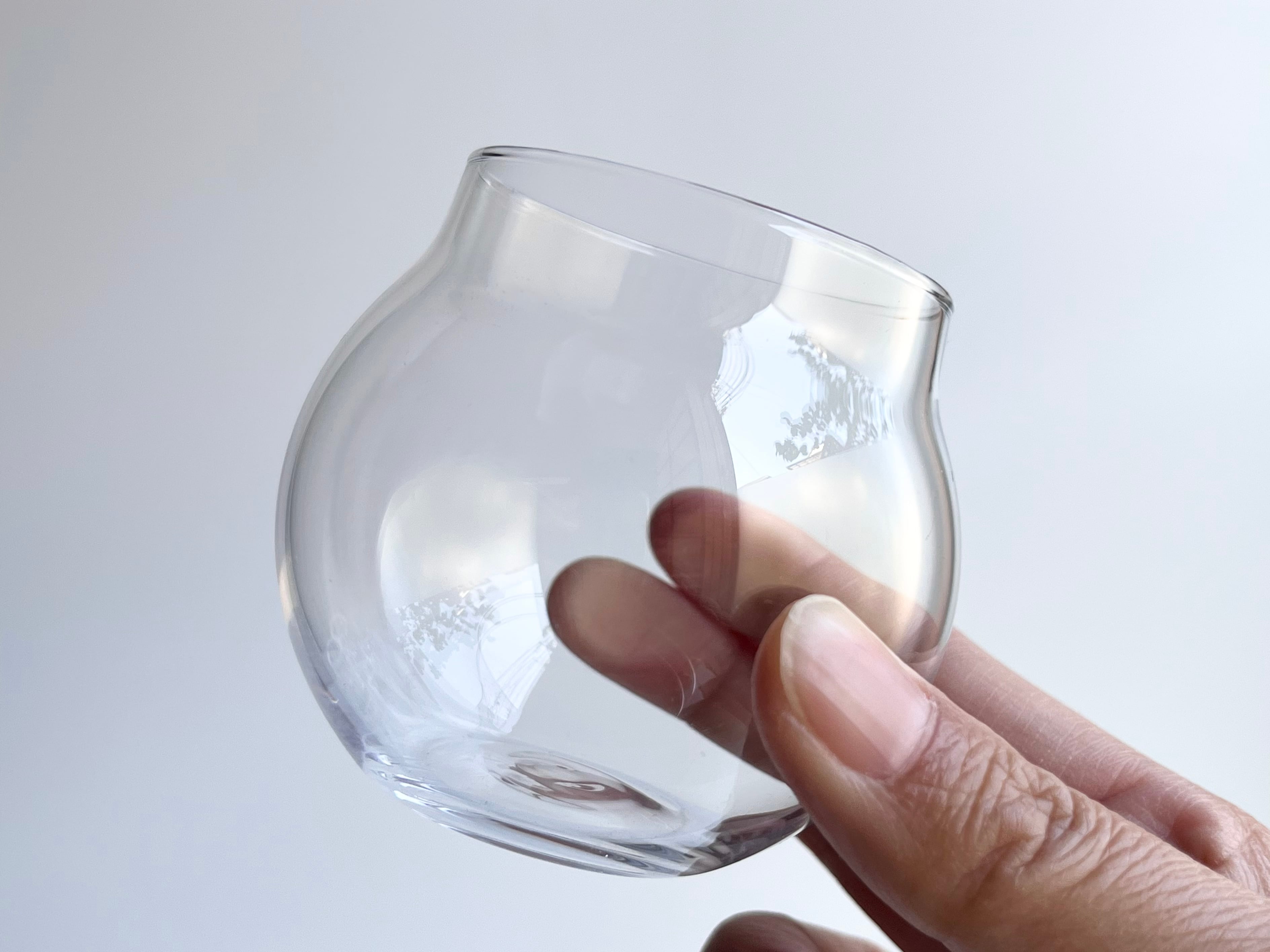 手のひらで転がしながらお酒の香りを楽しむことを目的に丸いフォルムにデザインされていますが、ころりとした愛らしい姿はまるでオブジェのようでもあり、小さな花器としても楽しめるのではないかと思っています。