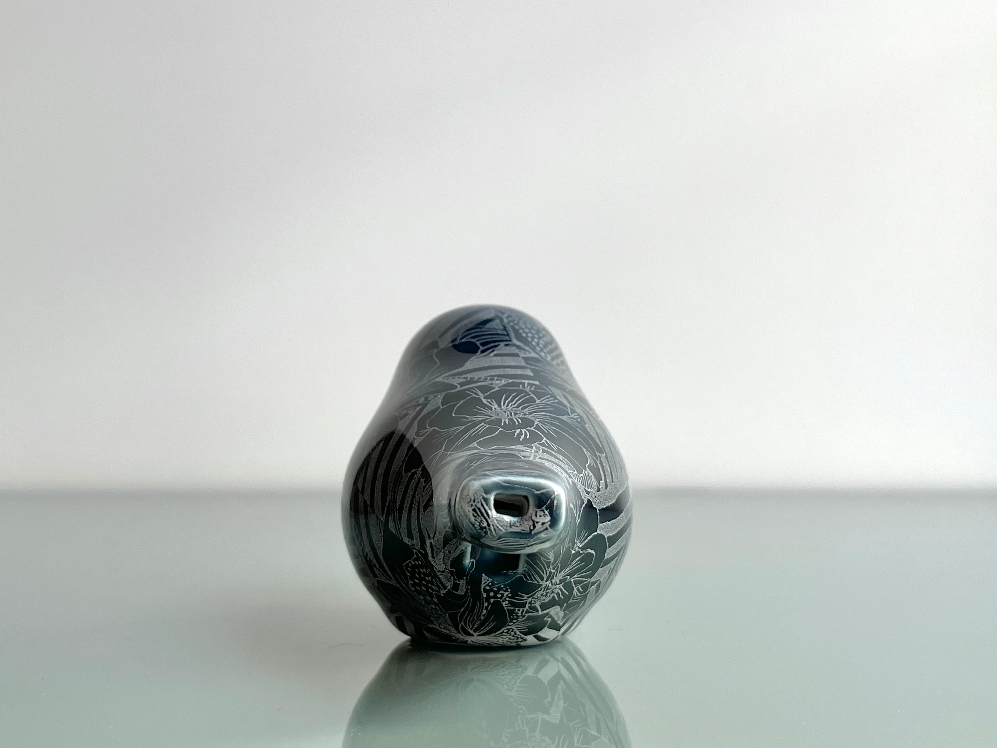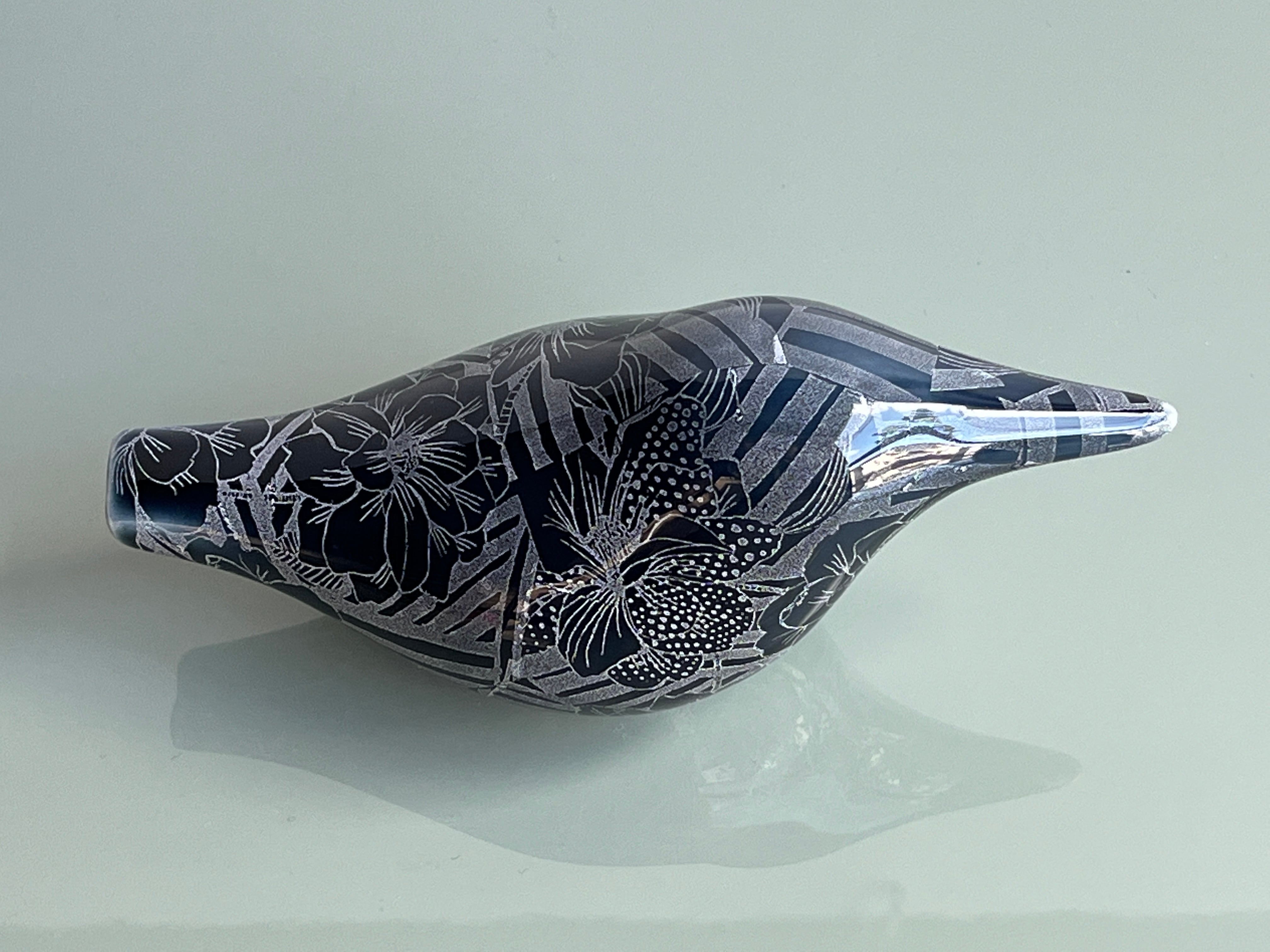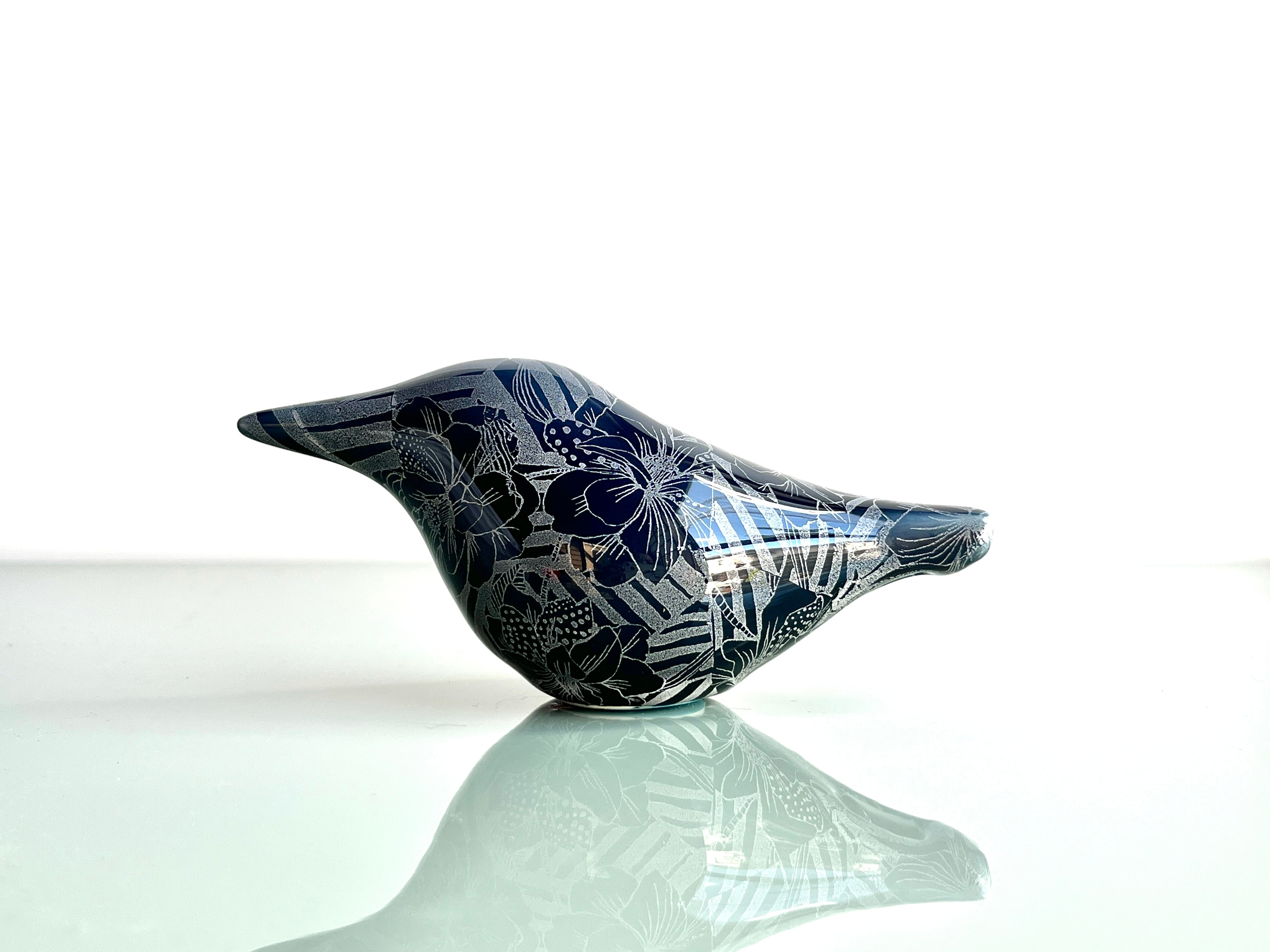 小鳥の本体には、ヘイニさんがデザインした図案がハンドデコレーションで施されています。(こちらの作品には藍のような深緑に幾何学的な図案と花模様がデザインされています。)