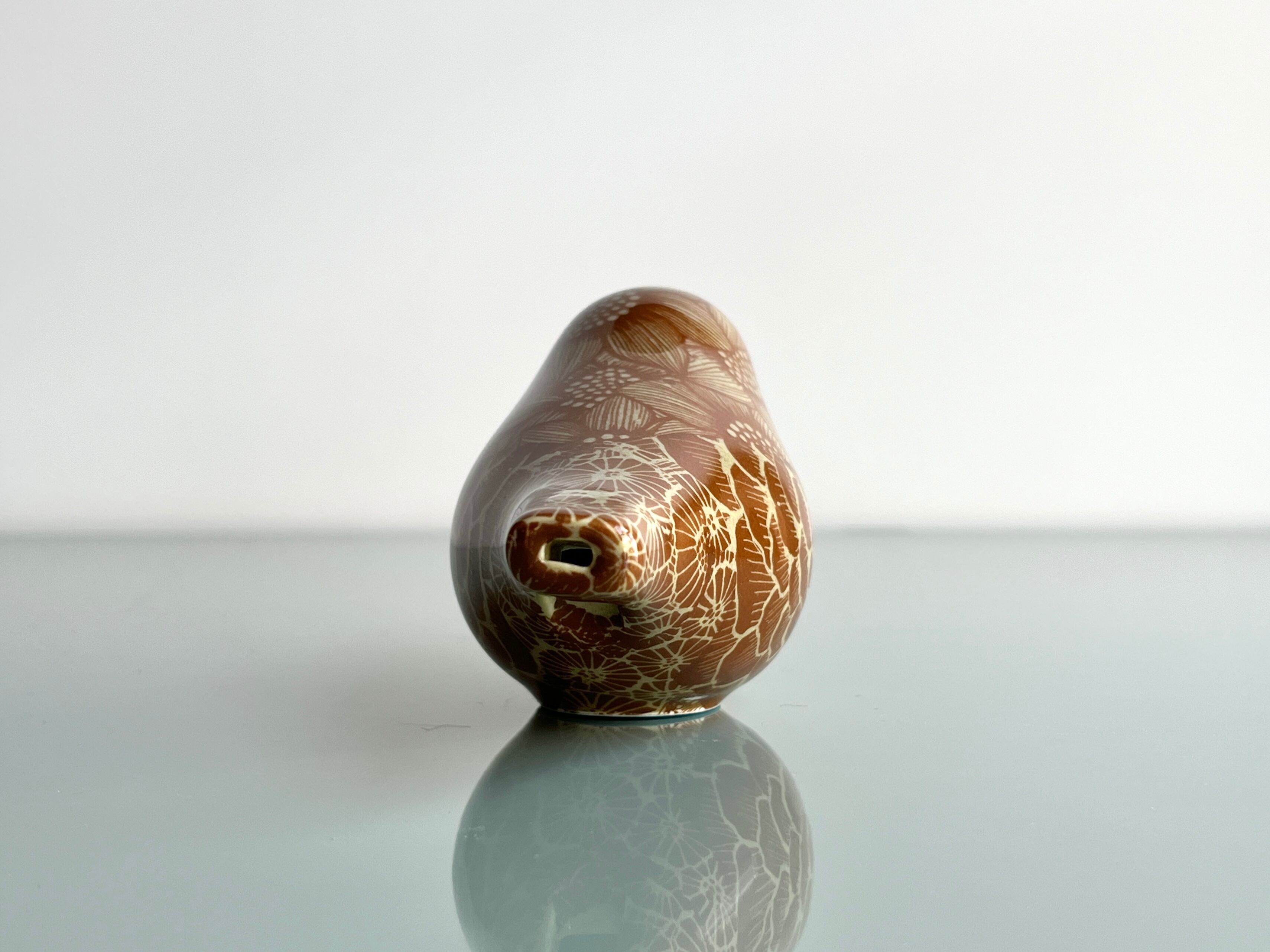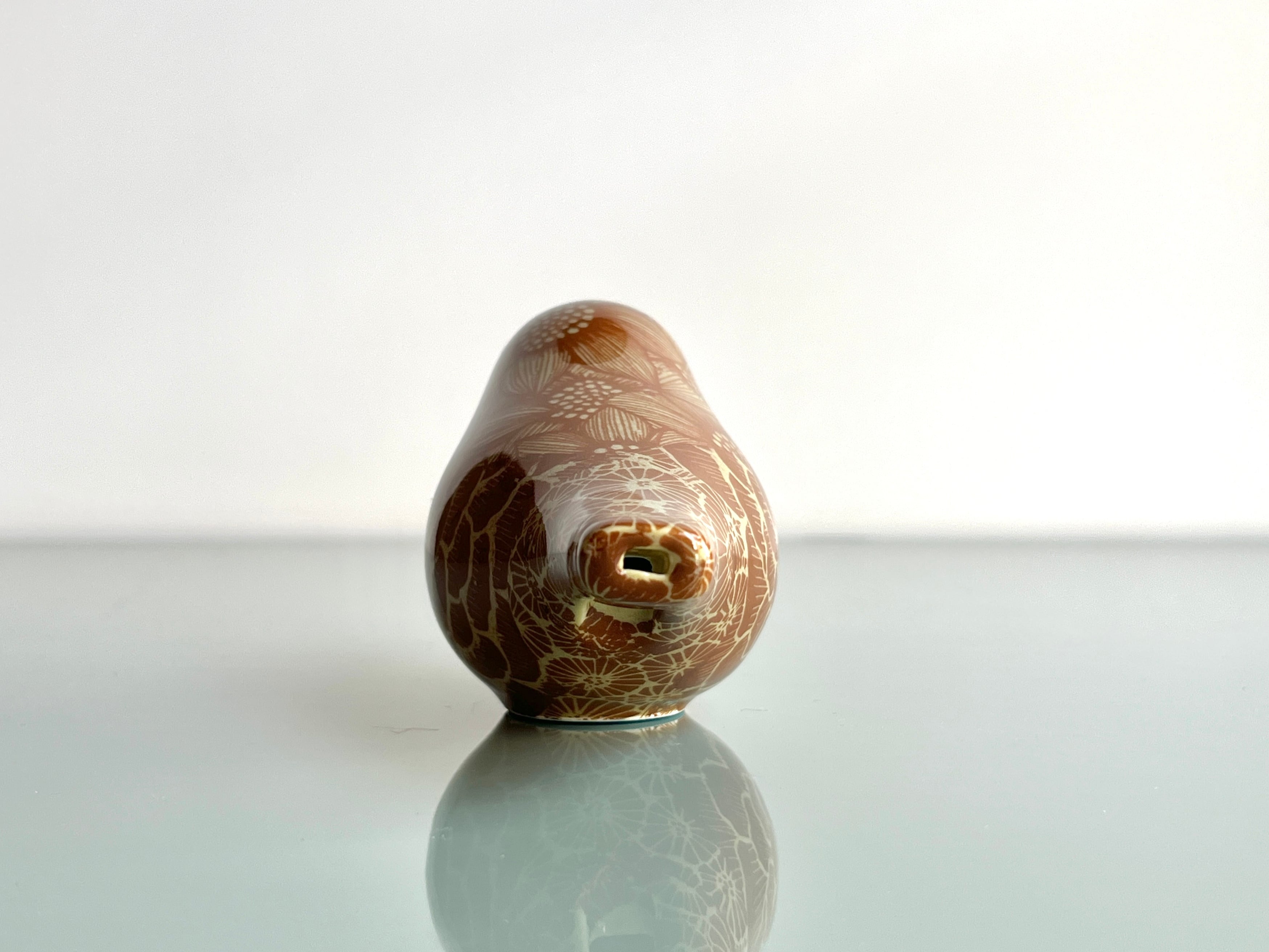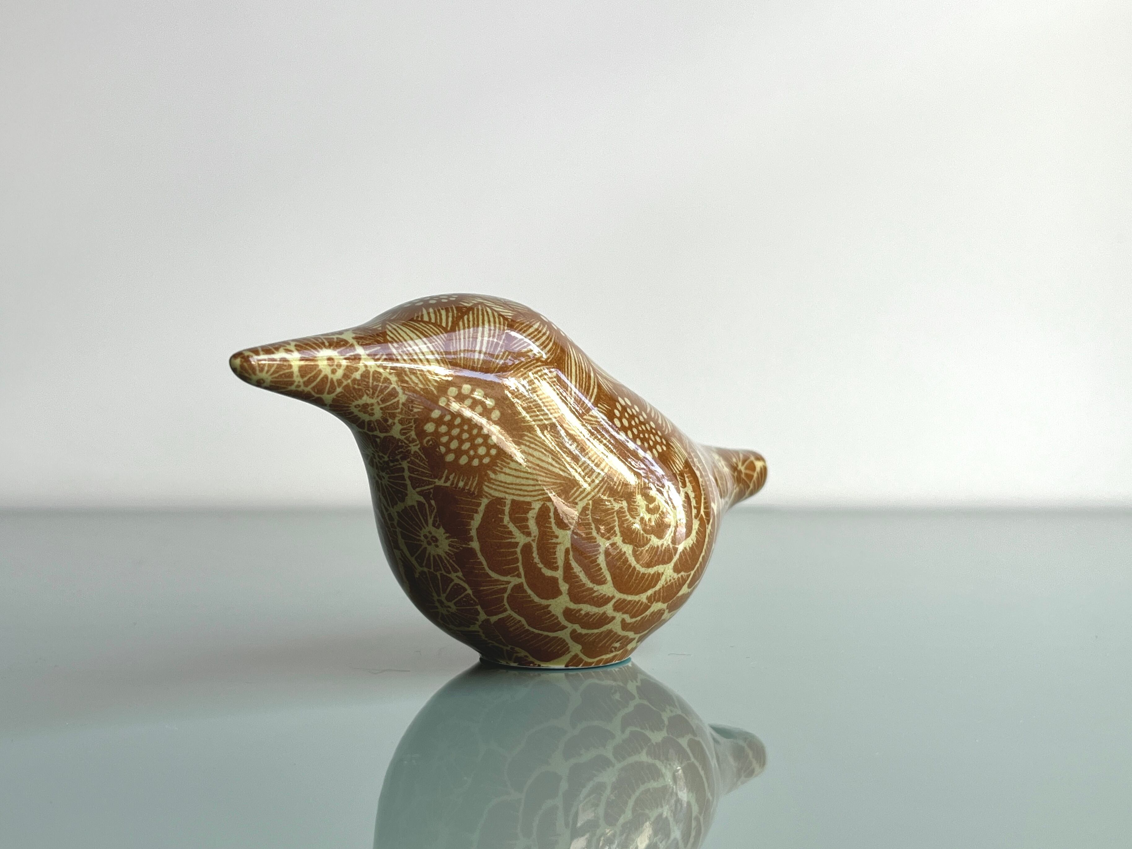 小鳥の本体には、ヘイニさんがデザインした図案がハンドデコレーションで施されています。(こちらの作品にはピスタチオカラーの釉薬をベースにブラウンで図案が施されています。)