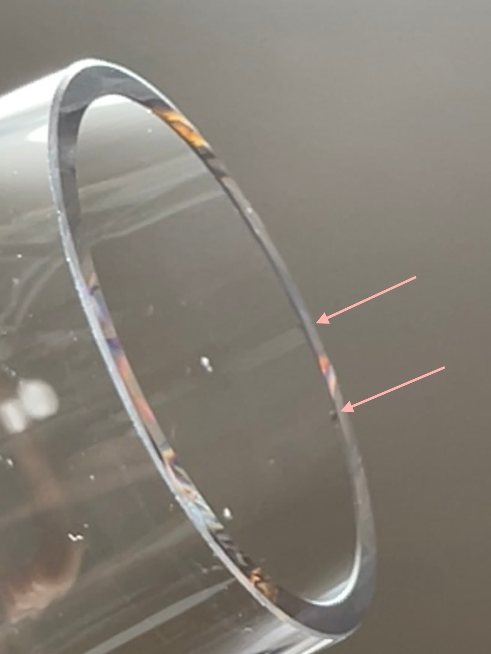ガラスカバー部分にやや擦れ傷が見られますが、光にかざしてしっかりと見なければさほど気にならない程度です。またガラスカバーの上部は切ざらしになっており、口縁の内側に製造段階のカット時に生じたと思われる極微細なチップが3か所見られます。