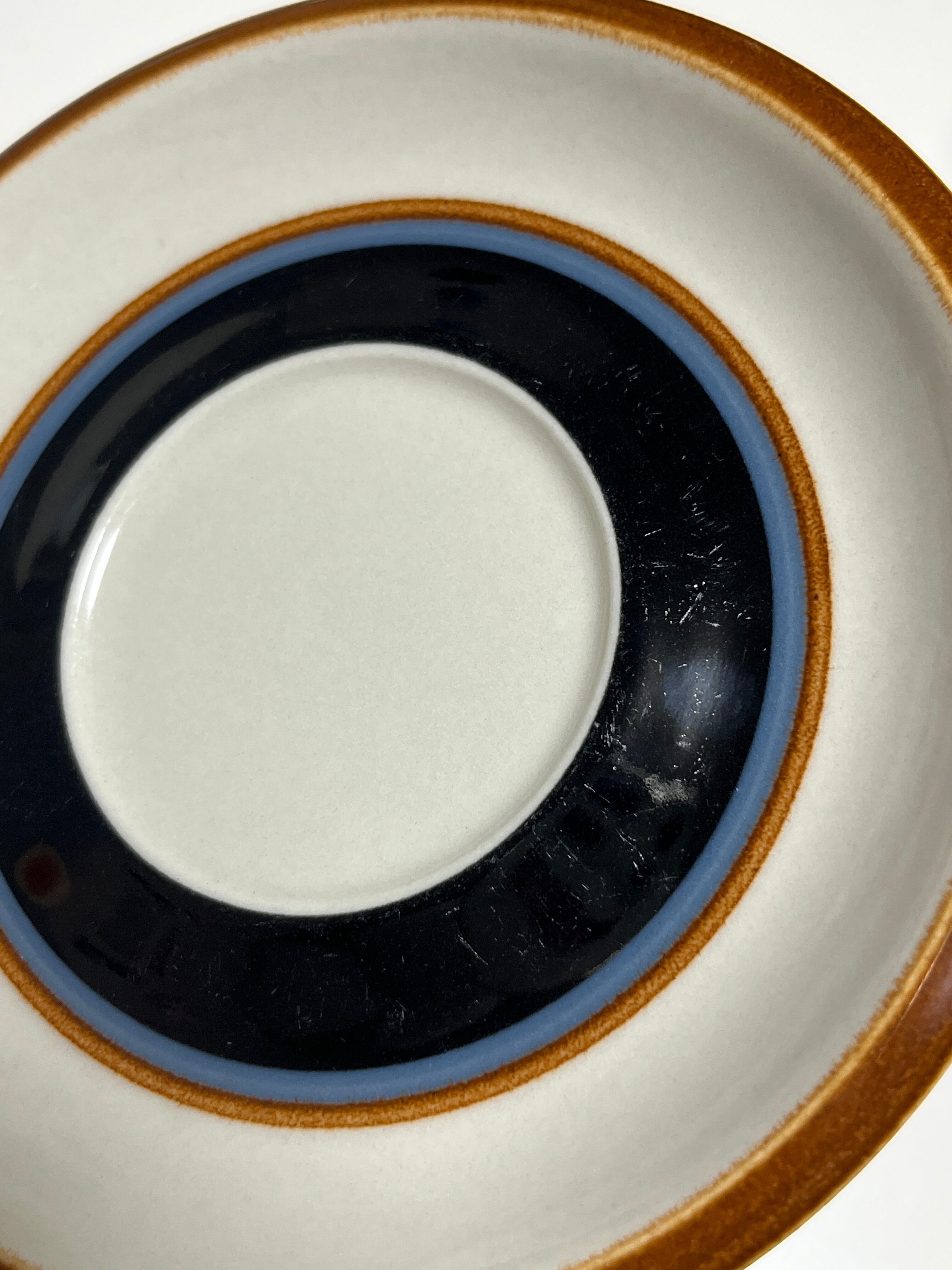 また、ソーサーの高台と、その付近に焼成時に生じた薄いヒビがあります。いずれも軽微であり釉薬の下にあるものなので使用に差支えはありませんが、価格にはこの点を反映させています。