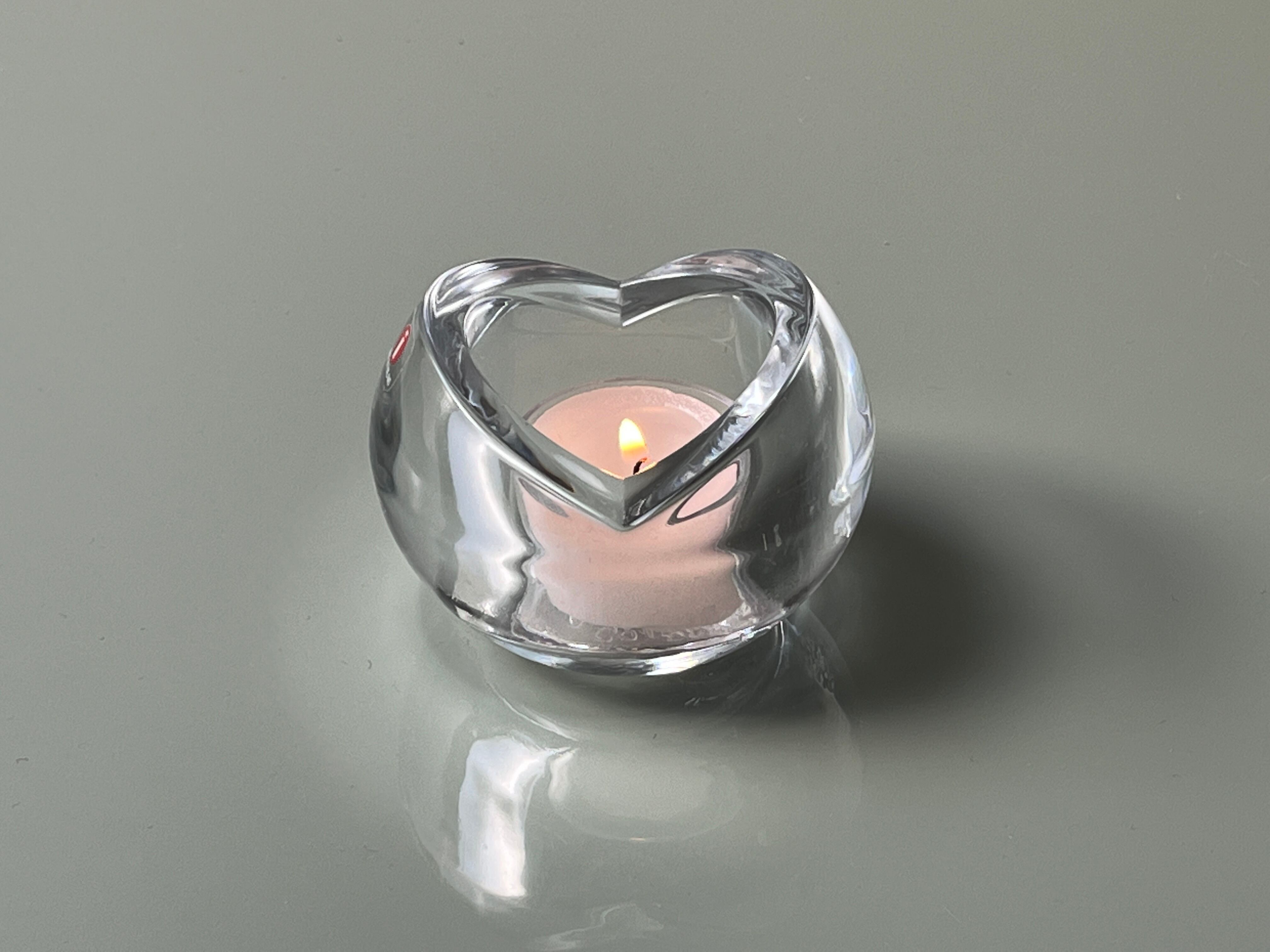 花や葉が開く前の神秘的な姿が象られた神秘的なデザインで、ぶ厚いガラスの谷間に見えるキャンドルの暖かな色合いは見るものを静かに癒し、思考を整えてくれるだろうと思います。
