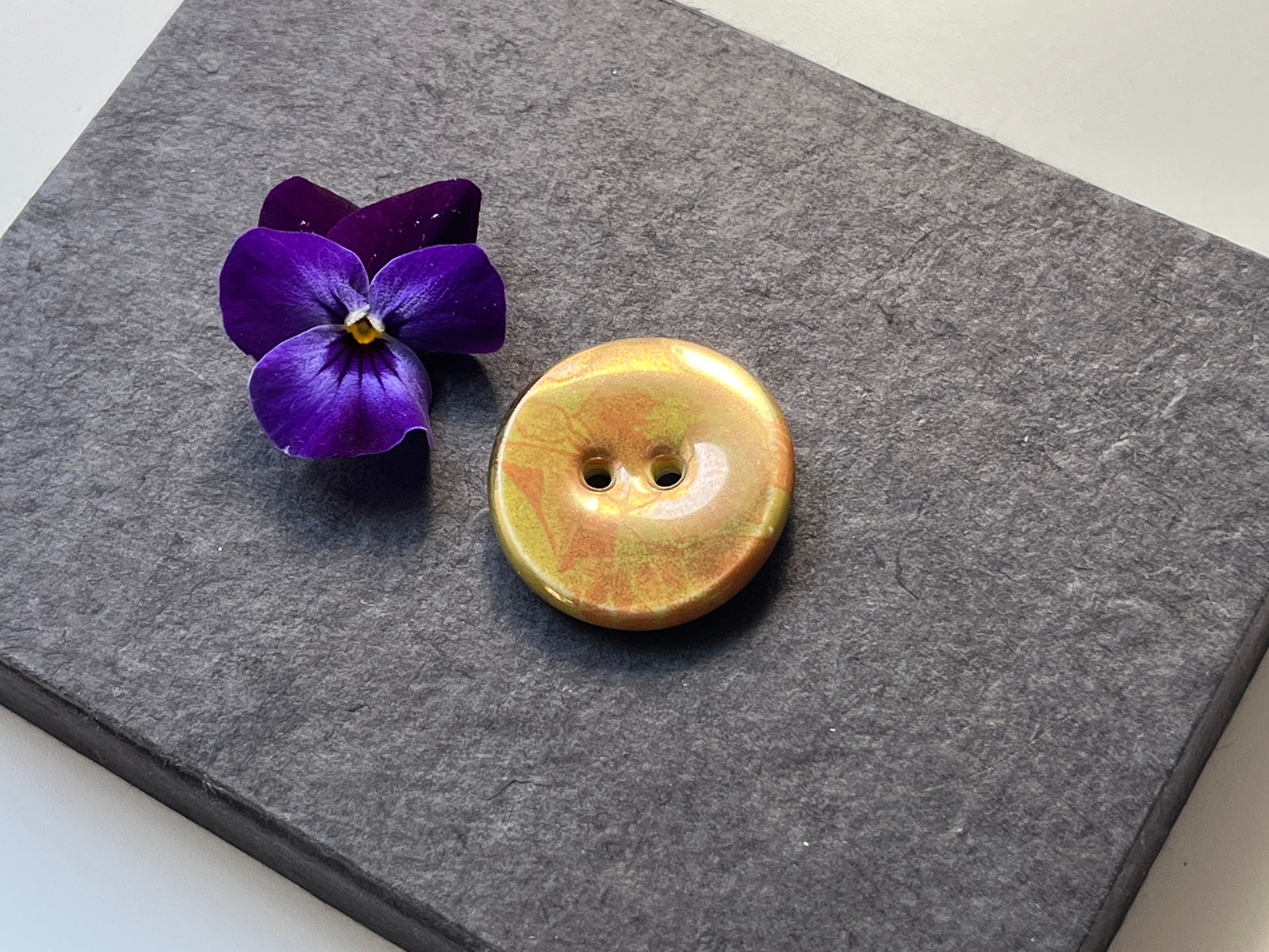 イエローの釉薬が掛けられたボタンをベースに、朱赤で花模様の図案が施され