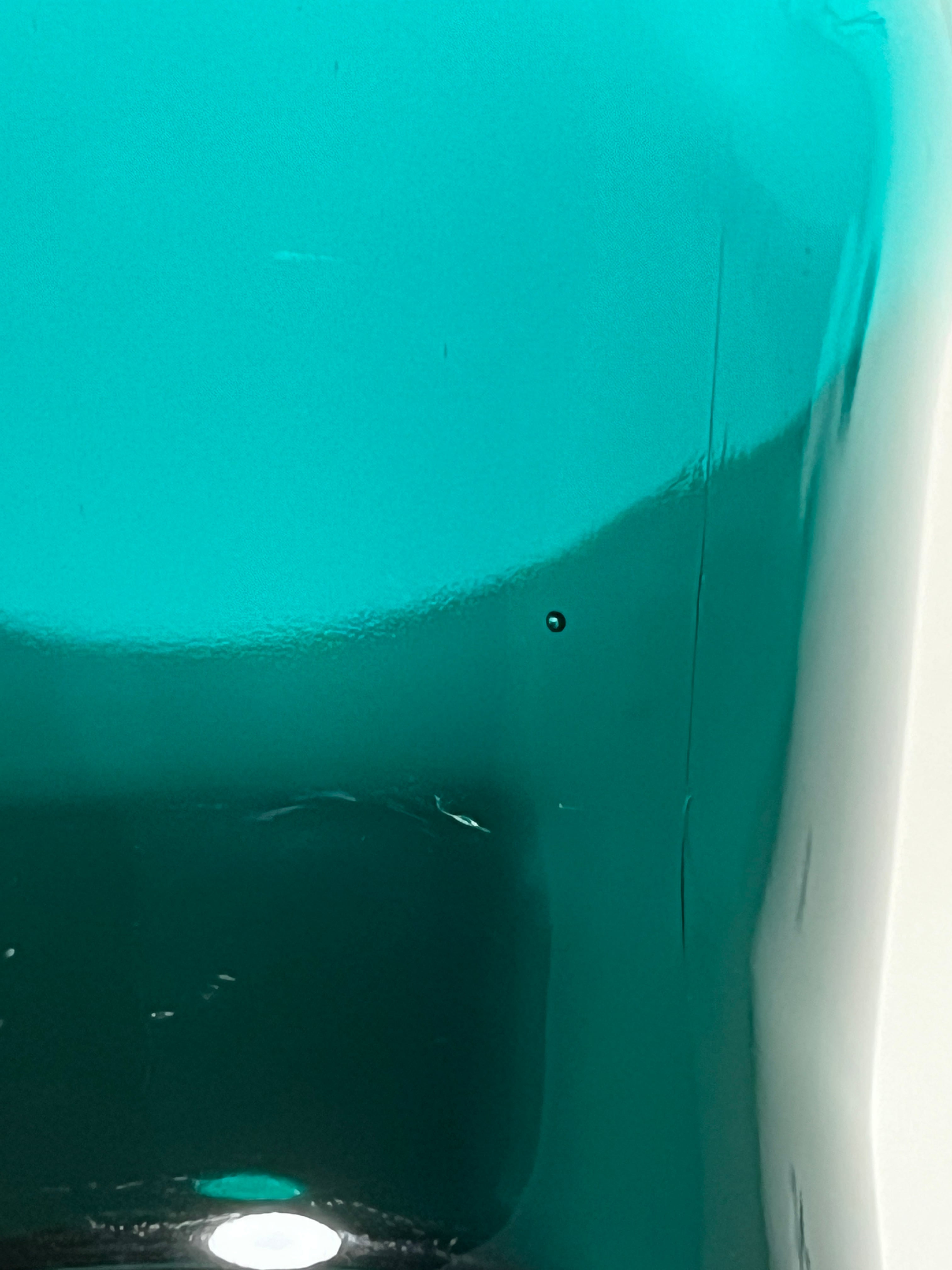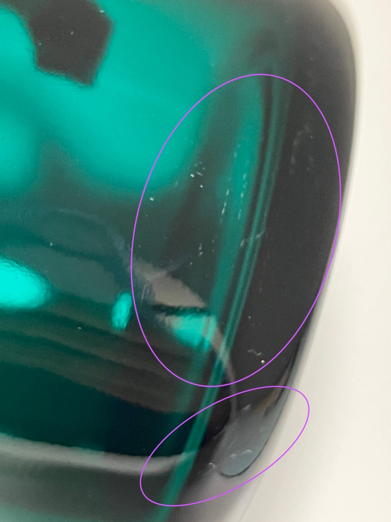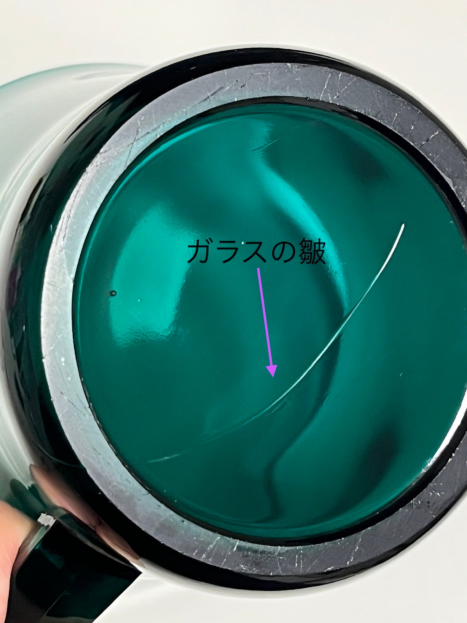 また、製造時のものですが、口縁付近内側に一か所形成不良なのか、ガラスの薄い段差があります。また、プレスガラスゆえのガラスのシワが底部を中心に複数みられます。