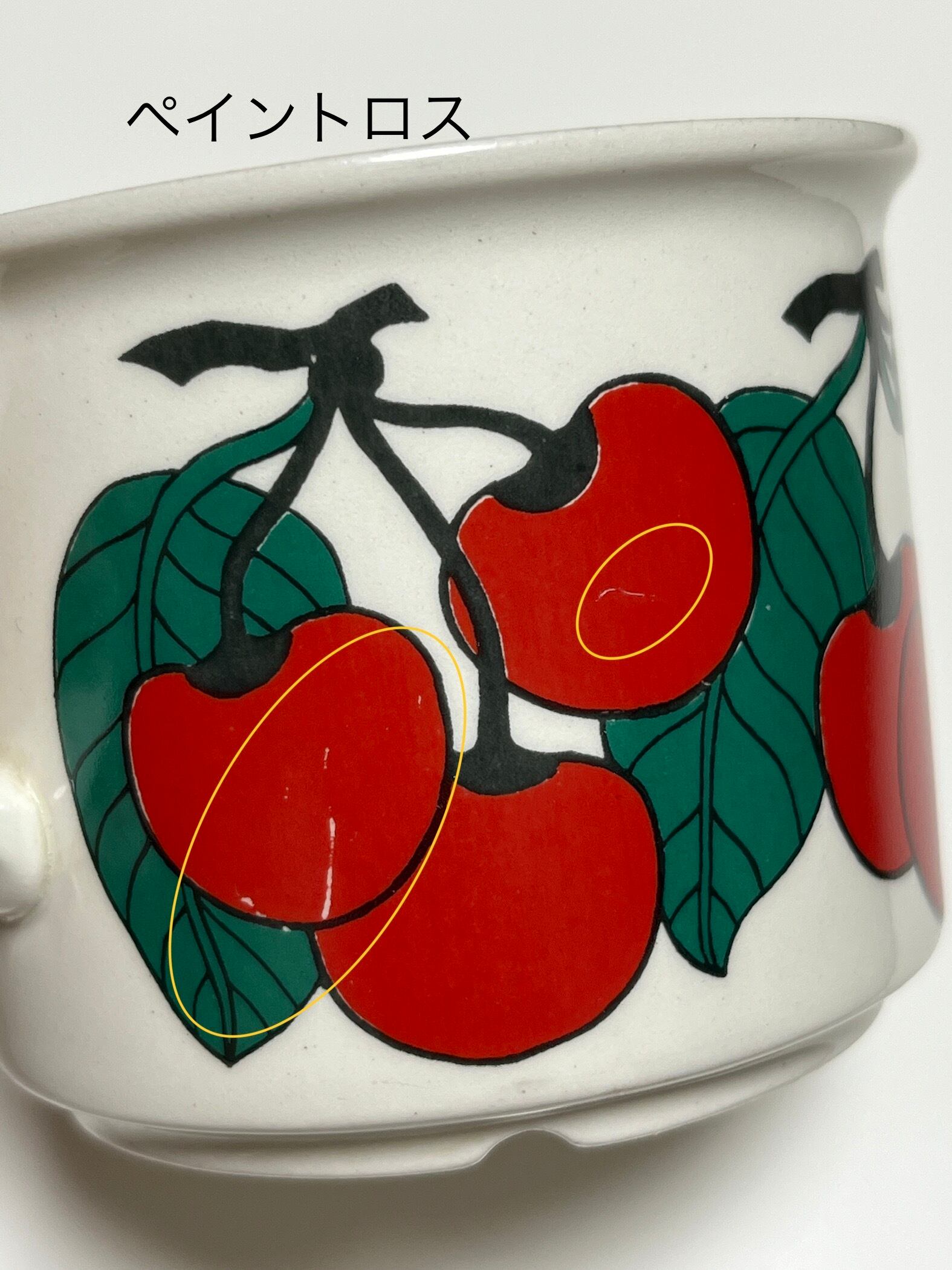 カップに数か所のペイントロスが見られます。また、製造時からの微細なペイント抜けや色むらが僅かにございます。(アウトラインと彩色の間の微細な隙間はこのアイテムの特性としてご理解ください)
