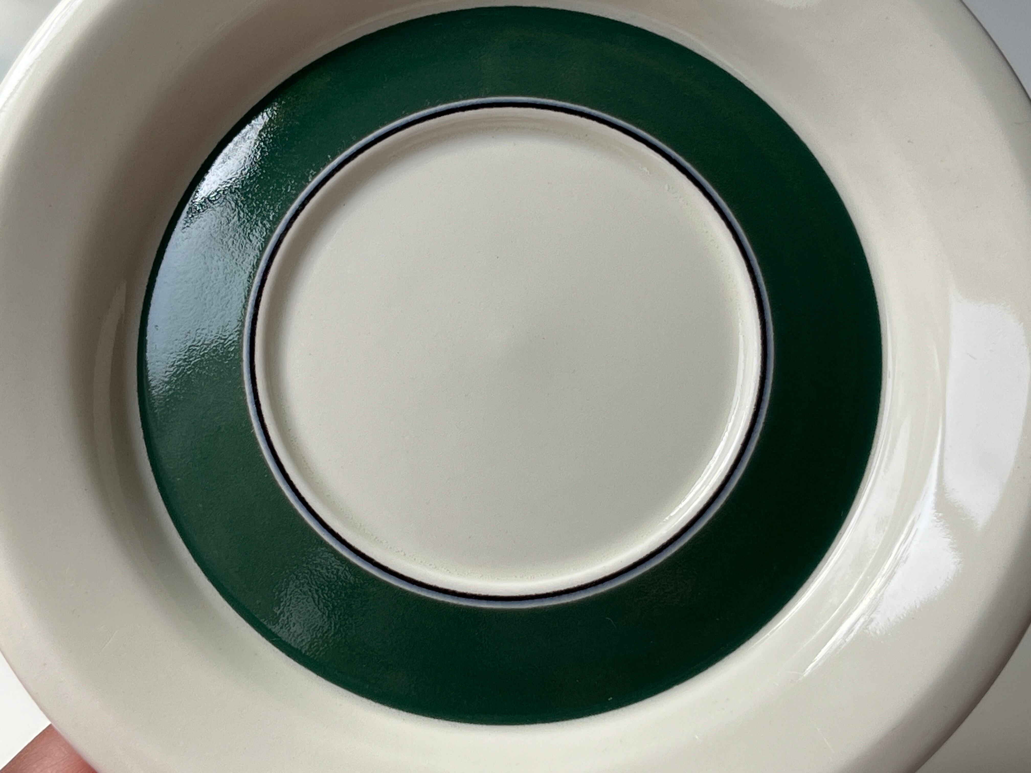 またソーサーはカップ底に擦れたような細かな擦れがやや多く見られ、カップを置く部分はやや艶が落ちています。また、元からのものですが、グリーンのラインの外側がやや色薄めに仕上がっています。