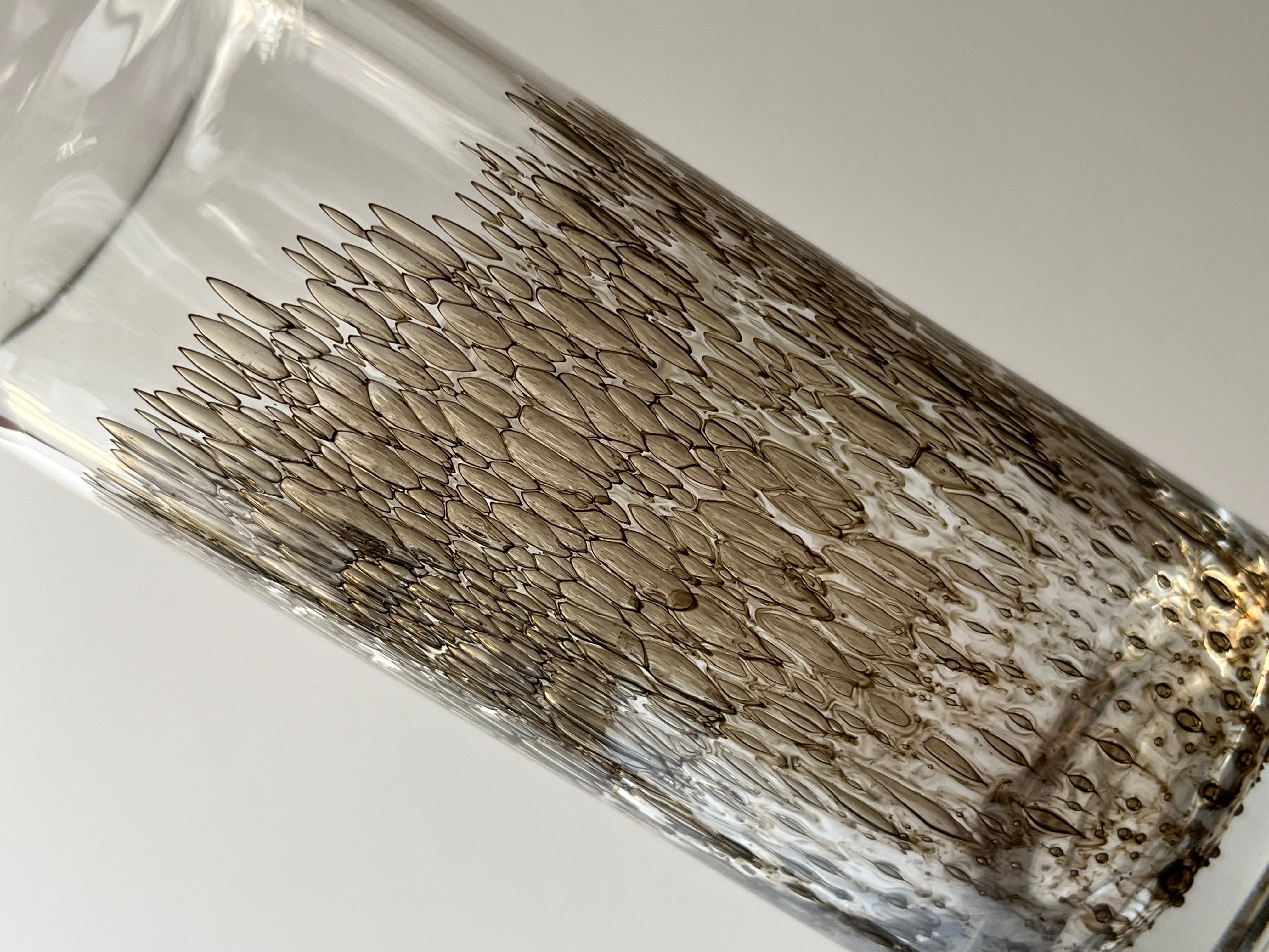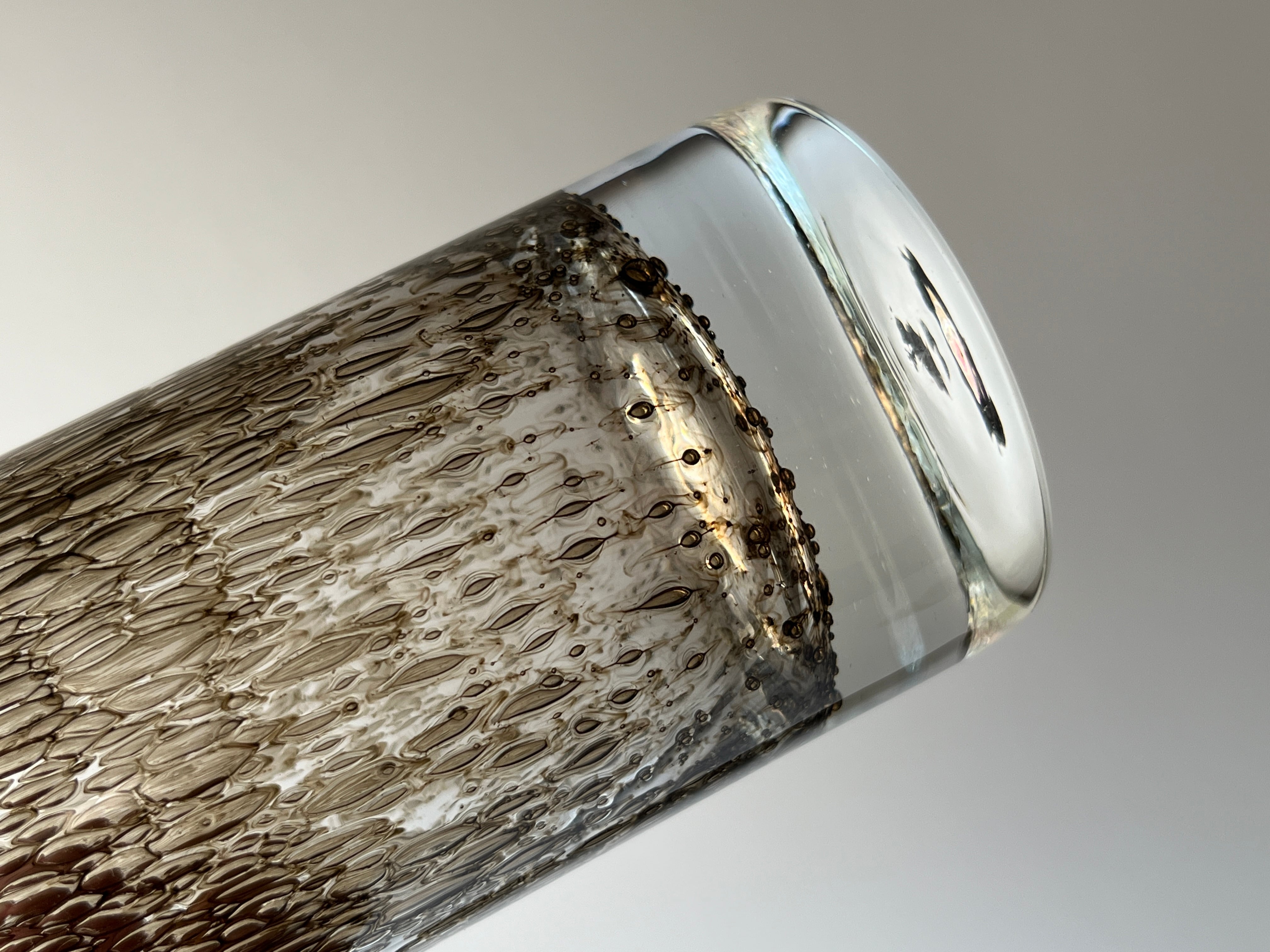 いずれもクリアガラスの内側に、焦げ茶色のガラスを用いて底から何かが沸き上がってくるようなデザインが施されていますが、全てマウスブローによる手仕事で作られており、一つ一つその表情は異なります。