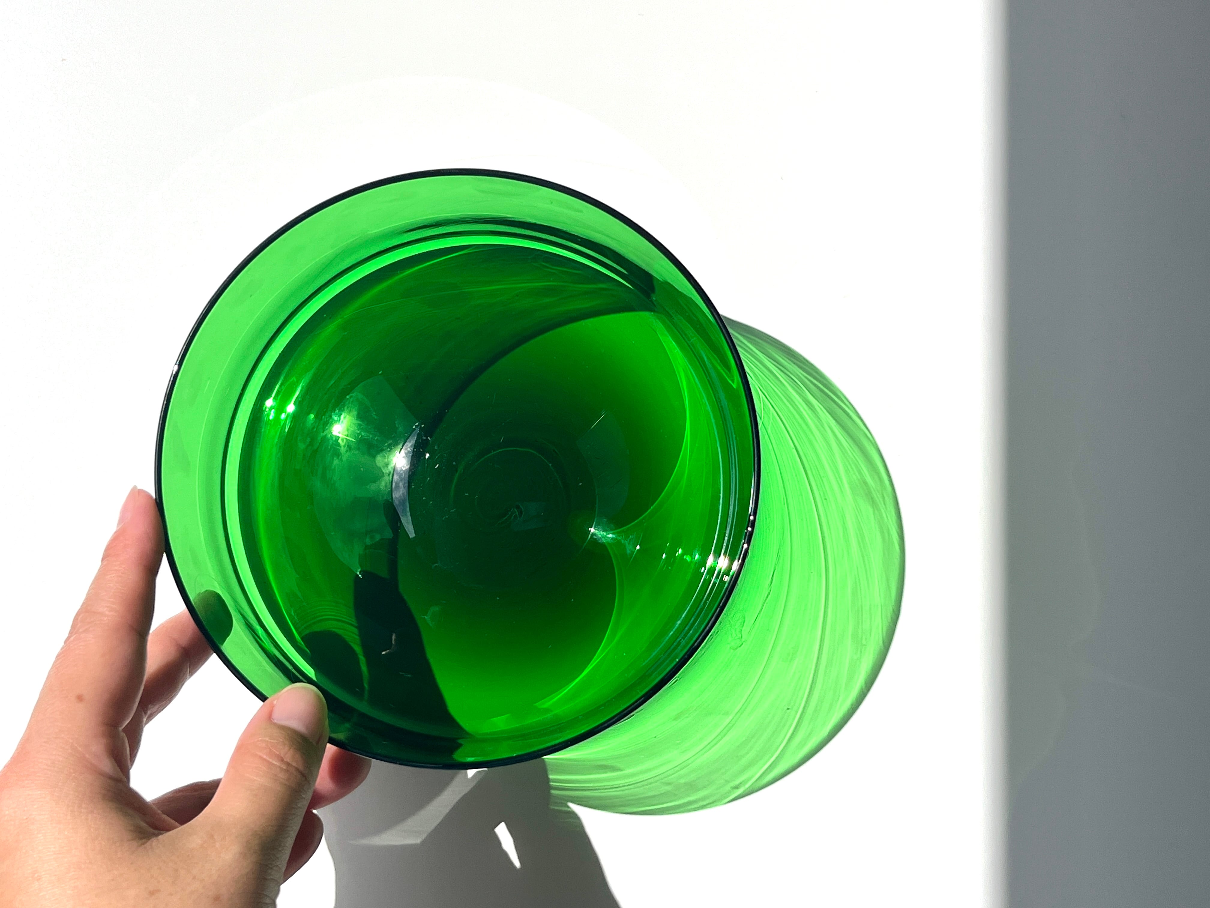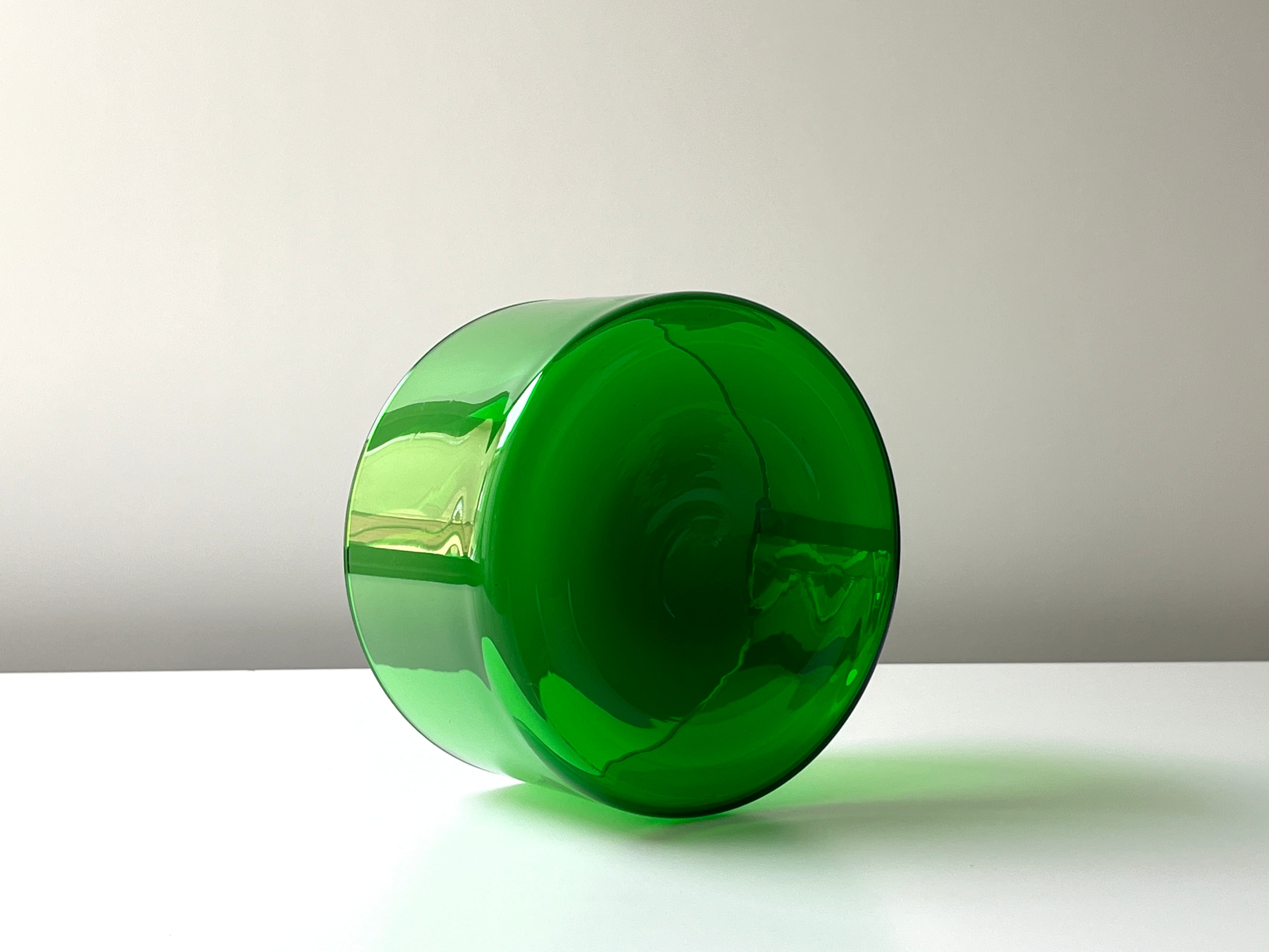 こちらはグリーンのガラスを用いた背の低い桶型のボウルです。