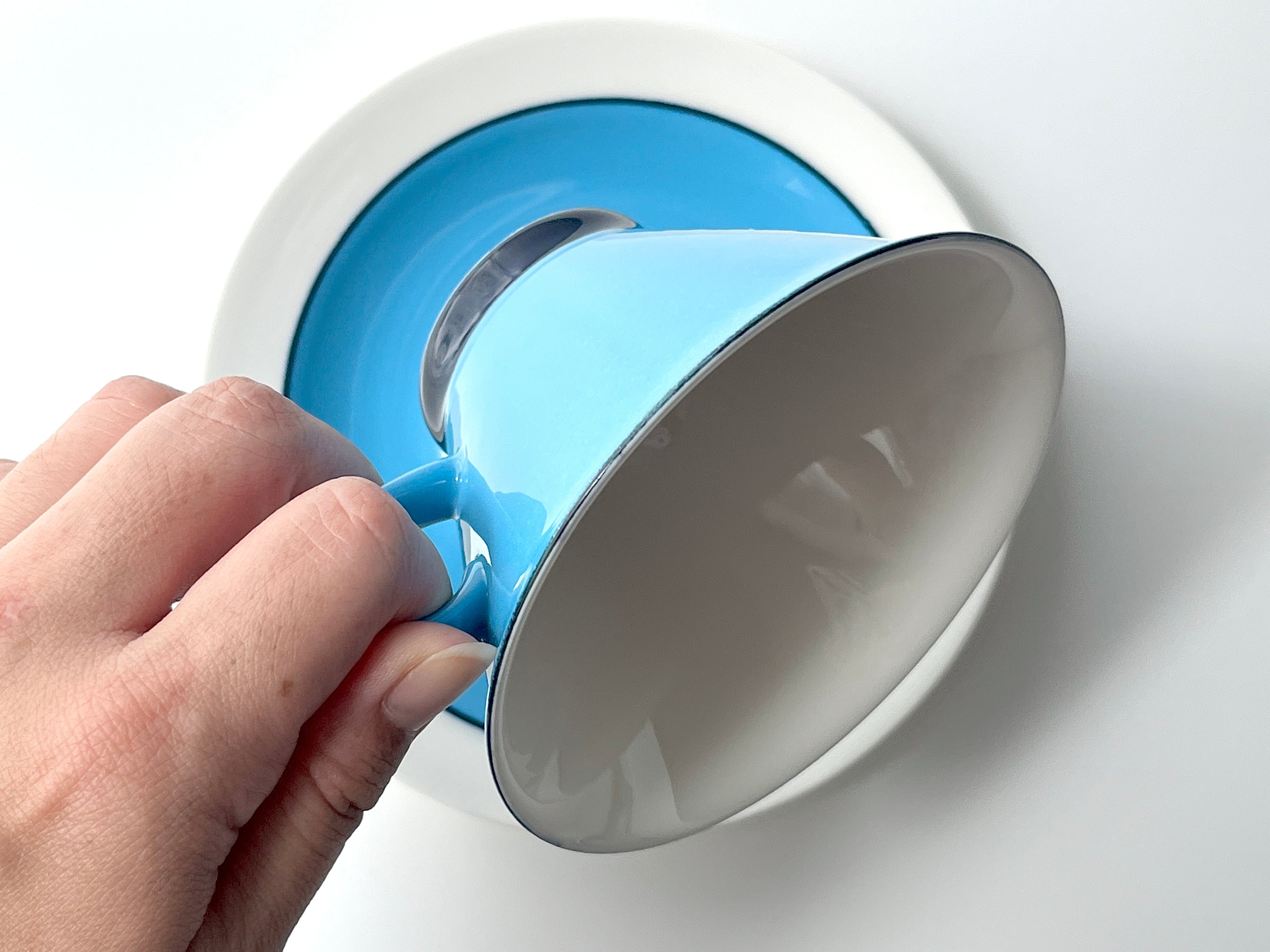 また釉薬は吹き付けたようなかかり方で、カップの縁に近づくに連れて素地の白の見える範囲が多くなり、したがって淡くなっていきます。口縁付近にターコイズの釉薬が乗り切っていないような箇所が僅かに見られます。