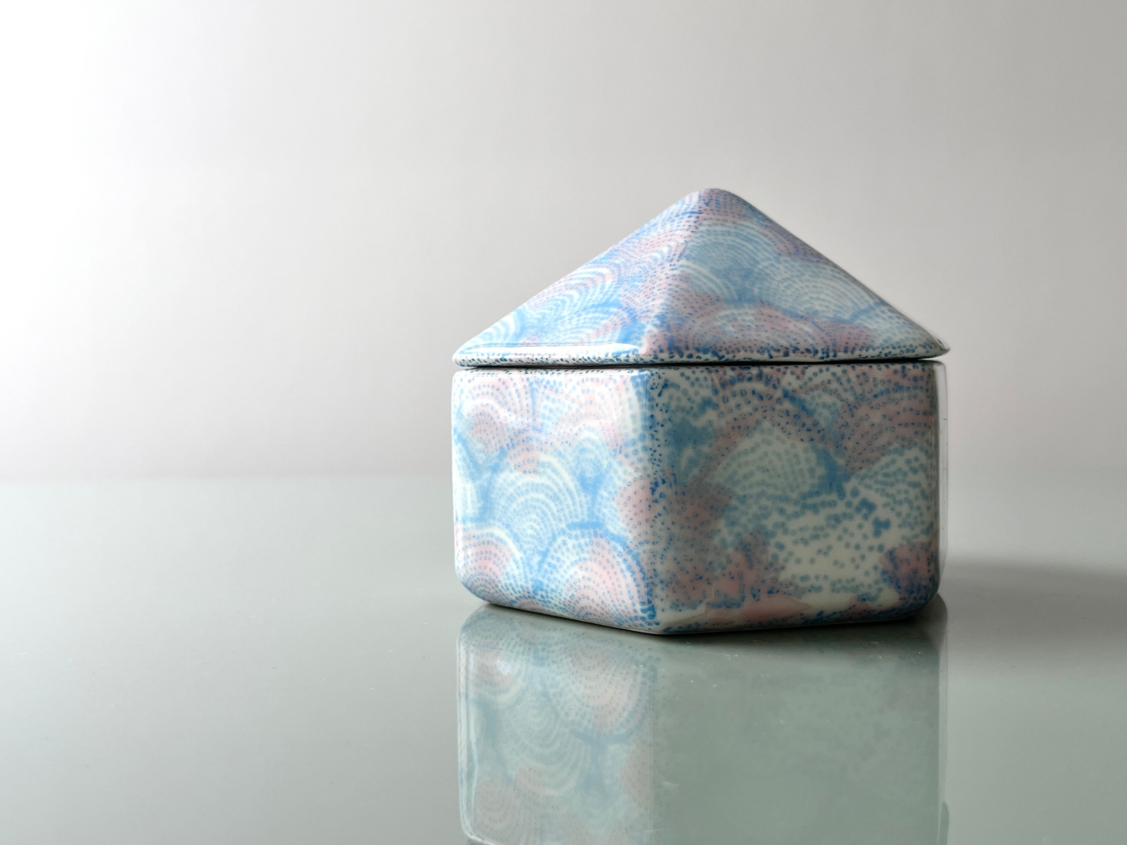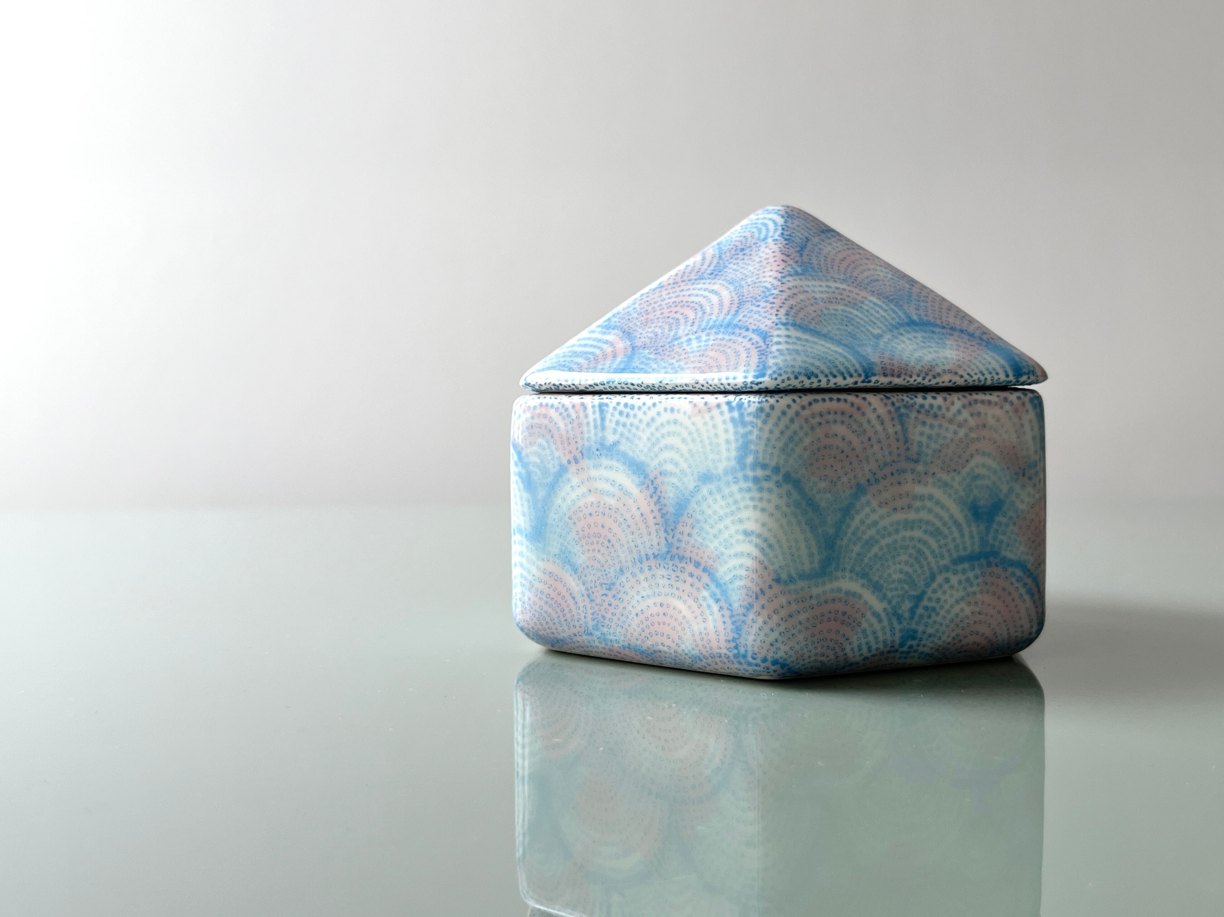 【Heini Riitahuhta】ヘイニ・リータフフタ Hexagon jar/ヘキサゴン ジャー(蓋物)ピンク花柄 ライトブルー青海波 重ね・アラビア Arabia Art Department