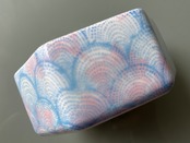 こちらは優しいピンクの花柄と、ライトブルーの青海波模様を重ね、その上から釉薬をぽってりと施した作品です。それぞれの色合いがうまく調和した大変凝った仕上がりです。