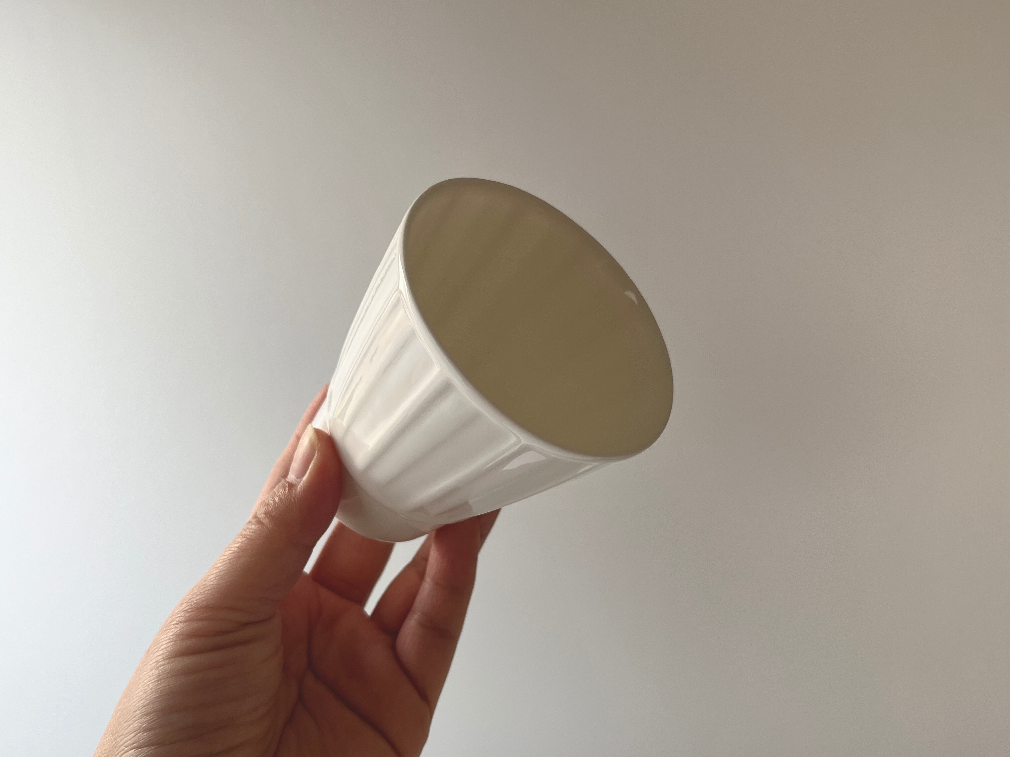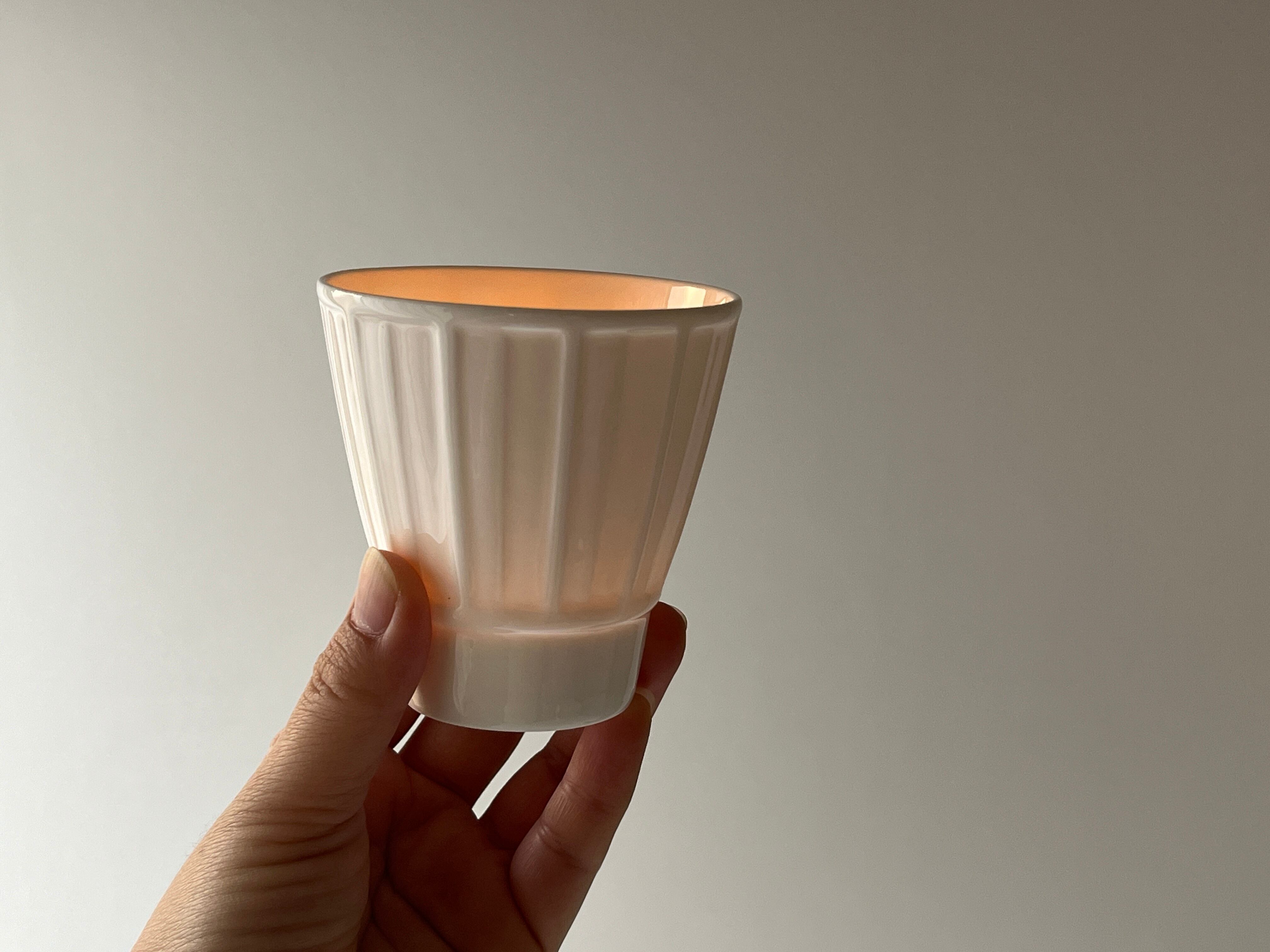 薄手の白磁にしのぎを思わせるストライプ状のエンボスを施し