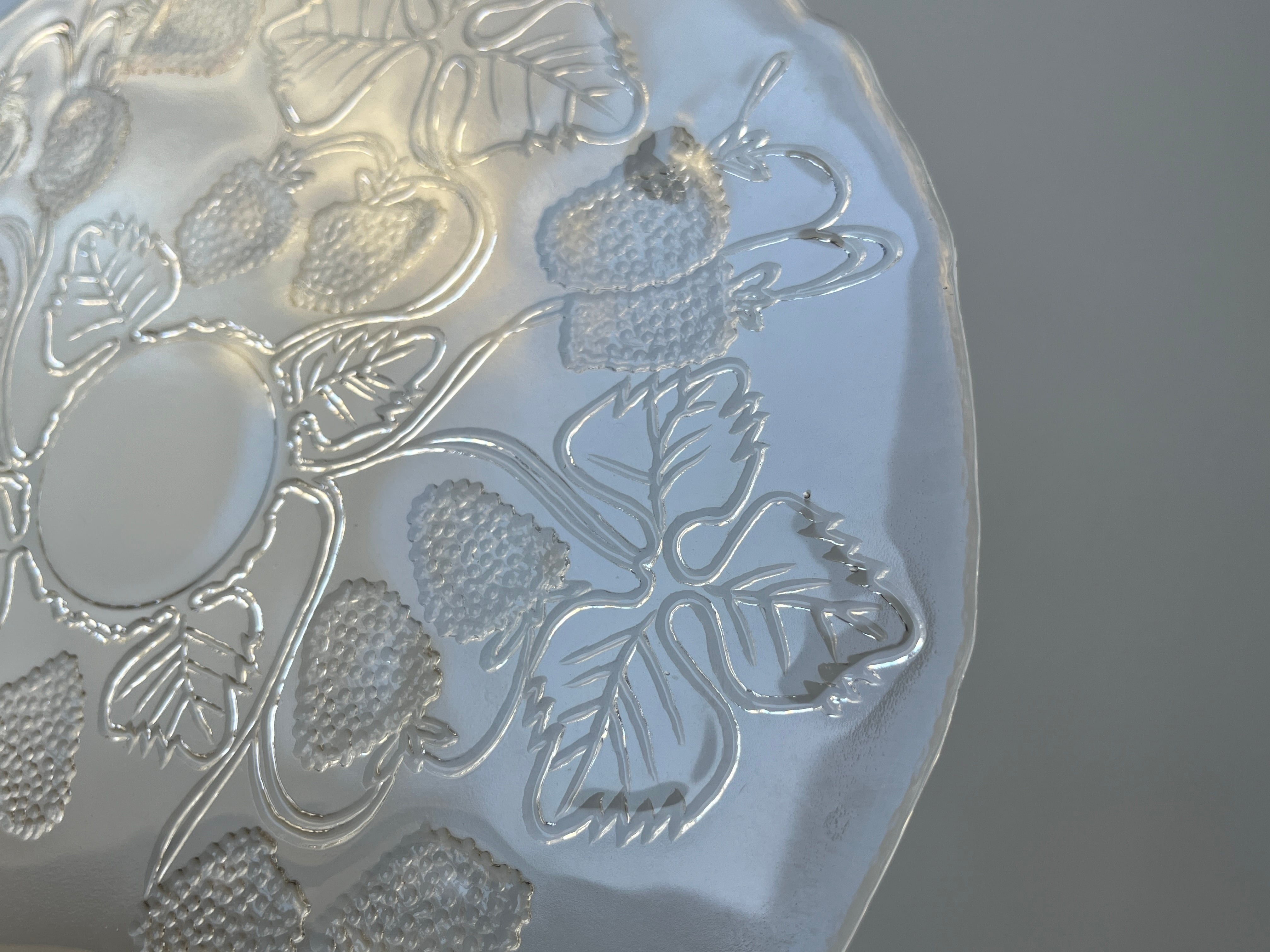 図柄はプラターの裏側にエンボスされており、表面は図柄に沿って多少波打ちますが基本はつるりと滑らかな状態です。大き目の野イチゴの裏側四点が少し厚みを持った形に仕上げられていて、プレートの支えになっています。