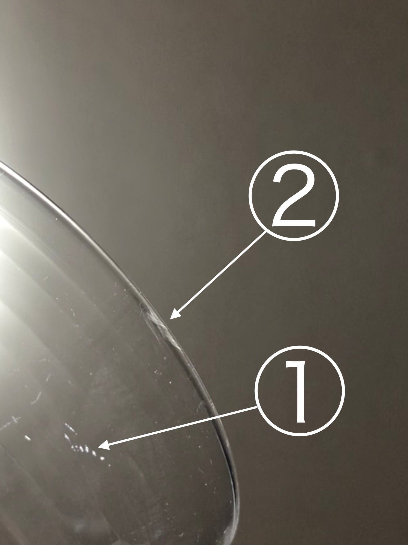 その他、製造段階のものですが、グラスの口をカットした後に焼いて角を丸める処理を施していますので、どの個体にもなだらかにガラスが窪んだり盛り上がっている部分や、口付近の白っぽい痕が見られます(光に透かしてよく見なければわからないようなものです)。また微細な気泡がみられることがございます。いずれもこのアイテムの製造方法による特性としてご理解ください。